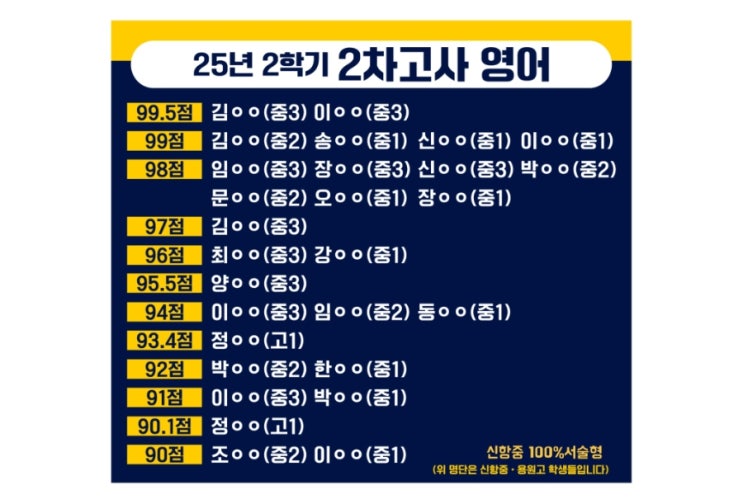25년 2학기 2차 고사 영어 성적 결과 이번 2차 고사에서도 우리 학생들이 눈에 띄는 성과를 보여주었습니다. 고득점자가 다수 배출되며 꾸준한 학습과 정확한 훈련의 힘을 다시 한번 확인할 수 있었습니다. 그중에서도 99.5점 두 학생은 오랜 시간 성실하게 쌓아온 태도와 노력이 고스란히 결과로 이어진 경우라 더욱 의미가 큽니다. 99.5점 김○○ 학생 (중3) 김○○ 학생은 초등 시절부터 6년째 함께하고 있는 학생입니다. 성실하고 꾸준한 학습태도로 기본을 흔들림 없이 쌓아온 친구입니다. 지속적인 성장을 선택해온 태도가 이번 결과로 자연스럽게 이어졌습니다. ‘꾸준함이 실력이다’라는 말을 가장 잘 보여주는 학생입니다. ?....... <img src="https://blogthumb.pstatic.net/MjAyNjAxMDRfMzMg/MDAxNzY3NTI0ODYyMjAx.XsUmXyCaLEwOpVIMRKz8tMFtqw07sY6qNxD7nhy2Qkcg.oqGiS1M3bnCQB2mkFSVofLF1t5jHRSUtj2h56y56flwg.JPEG/900%A3%DF1767524861308.jpg?type=s3" />