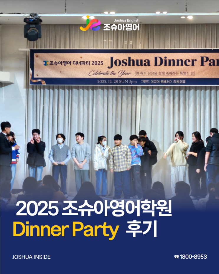 2025년 12월 28일(일) 오후 5시, 그랜드 머큐어 앰버서더 창원호텔 5층 가든하우스에서 <Joshua Dinner Party 2025>가 많은 분들의 관심과 참여 속에 무사히 마무리되었습니다. 이번 디너파티는 AI 기반 맞춤학습 시스템을 통해 한 해 동안 비약적인 성취를 이룬 학생들에게 감사의 마음을 전하고, 그 성장을 함께 기념하기 위한 자리입니다. 한 해 동안 묵묵히 자기 자리를 지켜온 학생들과 학부모님께 감사의 마음을 전하고, 조슈아영어학원의 교육 철학을 공유하는 시간이였습니다. 아이들의 성장이 ‘결과’로 증명되는 순간 이번 디너파티에는 ✔ 초등: 1등급 단어 10레벨을 통과한 학생 ✔ 중등: 학교시험 A등급 우수 학생 들이 초대....... <img src="https://blogthumb.pstatic.net/MjAyNjAxMDVfMjk3/MDAxNzY3NjA3MDA0MTU1.vzKKznXJyRFWR02WBe3ZLNExMZ57Rz3lgniG3SiOs30g.ARqh4-h0xjMQbztvHLgd5MTkWeWvTHsm6Zj7sVcepOog.PNG/%C1%B6%BD%B4%BE%C6%BF%B5%BE%EE_%BA%ED%B7%CE%B1%D7_%BD%E6%B3%D7%C0%CF_%C1%F6%C8%A3.png?type=s3" />