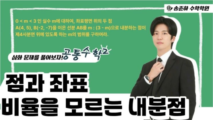 안녕하세요! 최고의 대치동수학학원 송준하수학학원입니다! 오늘도 최선을 다하겠습니다! 공통수학2 비율을 모르는 내분점 문제 오늘은 공통수학2의 1단원 점과 좌표 단원에서 나오는 문제인 선분의 내분점에 관한 문제를 풀어보겠습니다! 궁금하신 사항이 있으면 댓글로 물어봐주세요! 1. 내분점 공식을 사용하여 내분점을 구하기 2. 조건에 맞게 점의 존재범위 정하기 *다른 방법- 그래프를 통한 해결 <관련 해설영상> #공수2 #점과좌표 #내분점 #비율 #문제풀이 #대치동 #대치동수학학원 #대치동내신대비 #대치동수능대비 #휘문고 #중동고 #보인고 #영동일고 #중대부고 #단대부고 #진선여고 #경기여고 #경기고 #반포고 #보성고 #세화고....... <img src="https://blogthumb.pstatic.net/MjAyNjAxMjhfMTk2/MDAxNzY5NTg4MDMzODU3.HXDvFPwRJ1FpM92ehqboW-YELtPFY58m1dWCLMRqwi4g.5jdJy9MxAZyKJqx9IE7AsZ1sQlQCSN4ETg21TNYfcqUg.JPEG/900%A3%DFy%B0%F8%BC%F62_%C1%A1%B0%FA%C1%C2%C7%A5_%BA%F1%C0%B2%C0%BB_%B8%F0%B8%A3%B4%C2_%B3%BB%BA%D0%C1%A1_%B9%AE%C1%A6.jpg?type=s3" />
