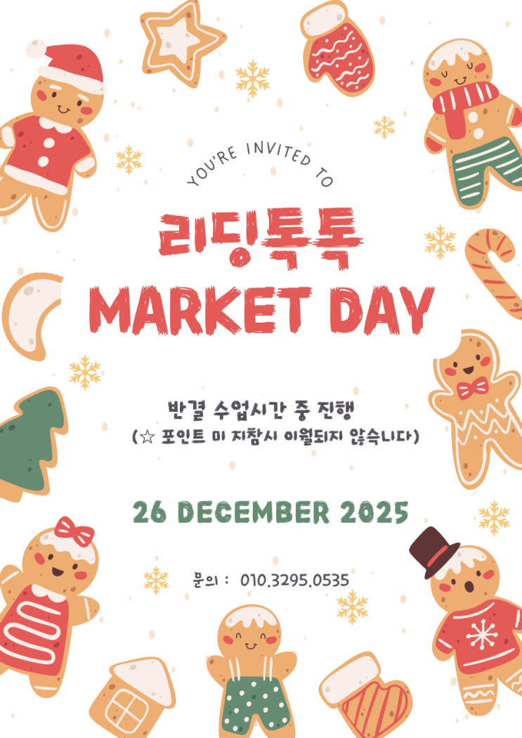 리딩톡톡은 일년에 두번 마켓데이를 해요. 그동안 열심히 공부한 아이들에게 주는 선물이지요♡ 숙제만 잘해오면 누구나 선물꾸러미를 잔뜩 챙겨갈수 있습니다. 숙제 완료율 95% 이상! 영어숙제 때문에 엄마가 더 힘드시다구요? 리딩톡톡이 정답입니다!! #리딩톡톡 #길동파닉스 #길동원서수업 #길동초영어 #신명초영어 #길동영어학원 <img src="https://blogthumb.pstatic.net/MjAyNTEyMTlfMTI4/MDAxNzY2MTIzMzI4NzMw.nrc6J_5DK93dbJOuOkbgcis1_GVsGa8TIt7cNXoZOBAg.bWmwTr7kVjZa16Q7iEDH-7aHp2J0Ff_z5rFF1yMdFckg.PNG/900%A3%DFRed_And_Brown_Illustrative_Cookie_Christmas_Market_Flyer%A3%DF20251219%A3%DF112510.png?type=s3" />