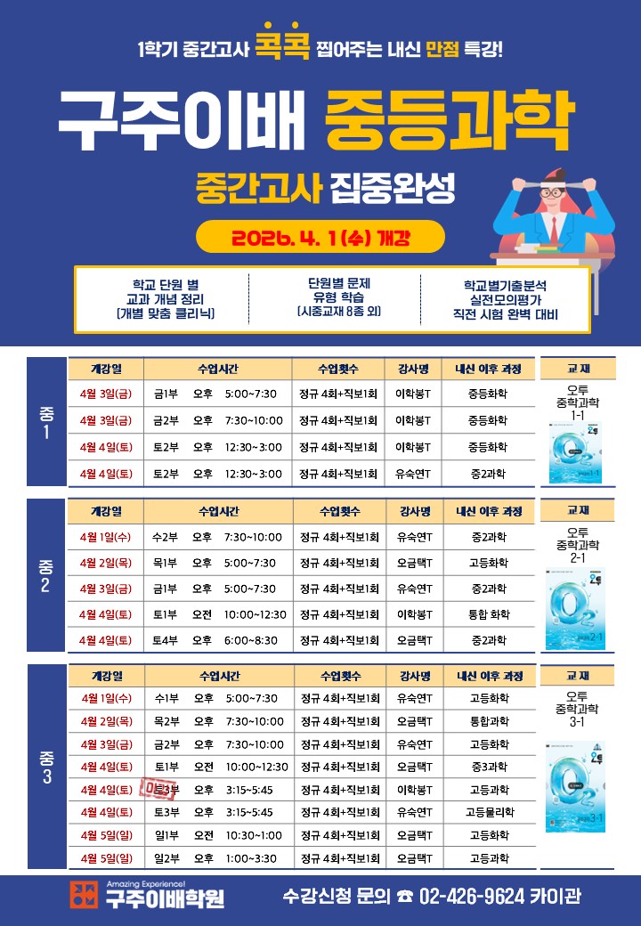 안녕하세요. 구주이배학원입니다. 중학교 새학년 입학한지 얼마 되지 않은 것 같은데 벌써 중간고사를 준비해야하는 4월이 다가오고 있습니다. "친구야, 너 과학 공부 어떻게 하고 있어? " "첫 시험이라 범위도 많고 내용도 어려워서 고민이지? 아직 늦지 않았어! 4주면 충분해." ▶ 1~3주차: 개념은 탄탄하게, 문제는 다양하게! (8종 교재 완벽 반영) ▶ 4주차: 실제 시험처럼 모의고사 풀고 약점 보완! ▶ 직전 대비: 시험 전날, 뇌에 쏙쏙 박히는 핵심 요약 강의! 혼자 끙끙 앓지 말고, 강동 지역 내신 1타 강사진이랑 같이 준비하자. 너도 이번 중간고사에서 과학 100점의 주인공이 될 수 있어! "고민은 점수만 낮....... <img src="https://blogthumb.pstatic.net/MjAyNjAzMjNfMjgy/MDAxNzc0MjYyMzkxOTE2.8Huh6jEmmDpTfQHxnRDixjUGO9lHkD-lBYqpggtBz1Ag.atfhUSVxgxgT4dVCRuATFY5-VFiLxx5nQ2Cah7nL4sQg.JPEG/3%BF%F9_1%C7%D0%B1%E2_%C1%DF%B0%A3%B0%ED%BB%E7%B4%EB%BA%F1_%C6%AF%B0%AD_%B0%FA%C7%D0.jpg?type=s3" />