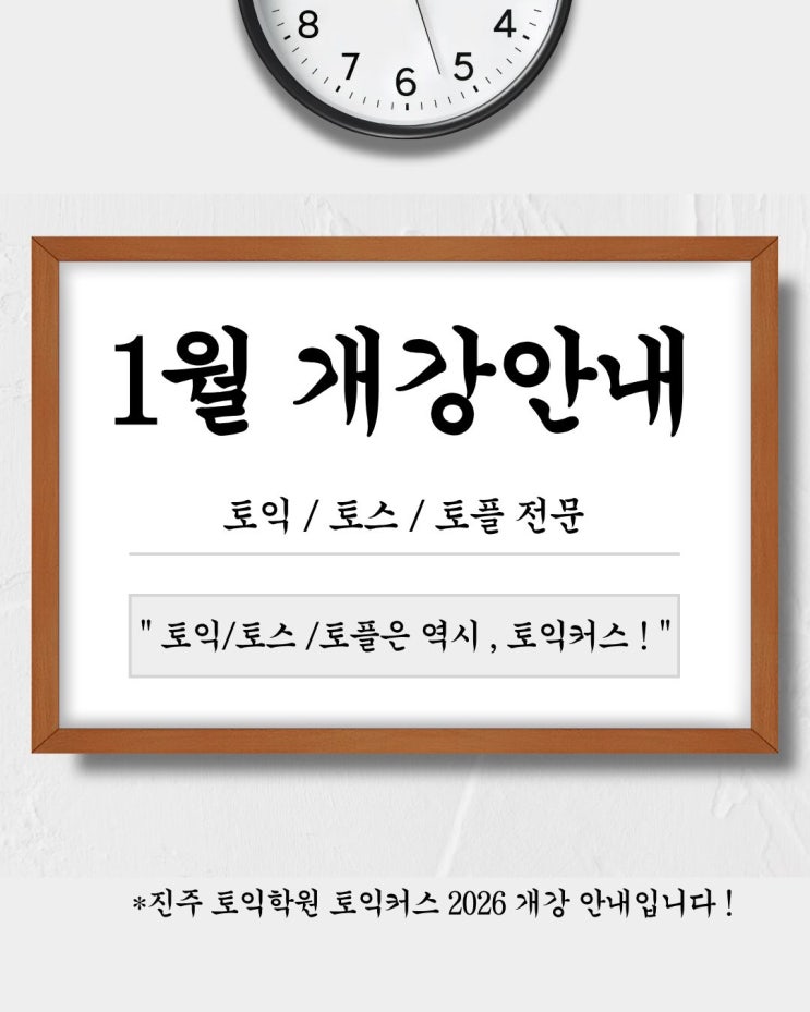 여러분 안녕하세요 ! 오늘은 2026년 1월 개강안내를 알려드리기 위해 돌아왔답니다 새로운 한 해는 어떤 한해가 되기를 희망하시나요? 토익 / 토스 / 토플 등 어학 관련 성적이 필요하신 분들, 혹은 아직 목표가 설정되어 있진 않지만 올 한해의 시작인 만큼 부지런히 무언가 성취해내고 싶은 분들 이라면 조심스럽게 토익커스에 오셔서 함께 영어 공부 하는걸 추천드립니다 !! 반구성 / 수업시간 안내 토익 -> (500반 / 700반 / 올떠먹반) 토스 토플 ⏰ 수업시간 : 상담 시 수강 희망하시는 시간대를 말씀해 주세요~! [토익] 1️⃣ 오전반 10:00~12:00 2️⃣ 오후반 14:00~16:00 3️⃣ 저녁반 19:00~21:00 [토스] ▶ 18:0....... <img src="https://blogthumb.pstatic.net/MjAyNTEyMTVfMjU2/MDAxNzY1NzkzMTIxNzQ4.907DA4FzdRPBYQuBsWQA7IVaR5wxnfZ6pIrYIMf5NeUg.5yNtgmG6Rl_U3egdDDqKDjaztfQuqhOEWJJQkWBBHCYg.JPEG/%C1%F8%C1%D6%C5%E4%C0%CD%C7%D0%BF%F8%C5%E4%C0%CD%C4%BF%BD%BA_1%BF%F9_%B0%B3%B0%AD%BE%C8%B3%BB.jpg?type=s3" />