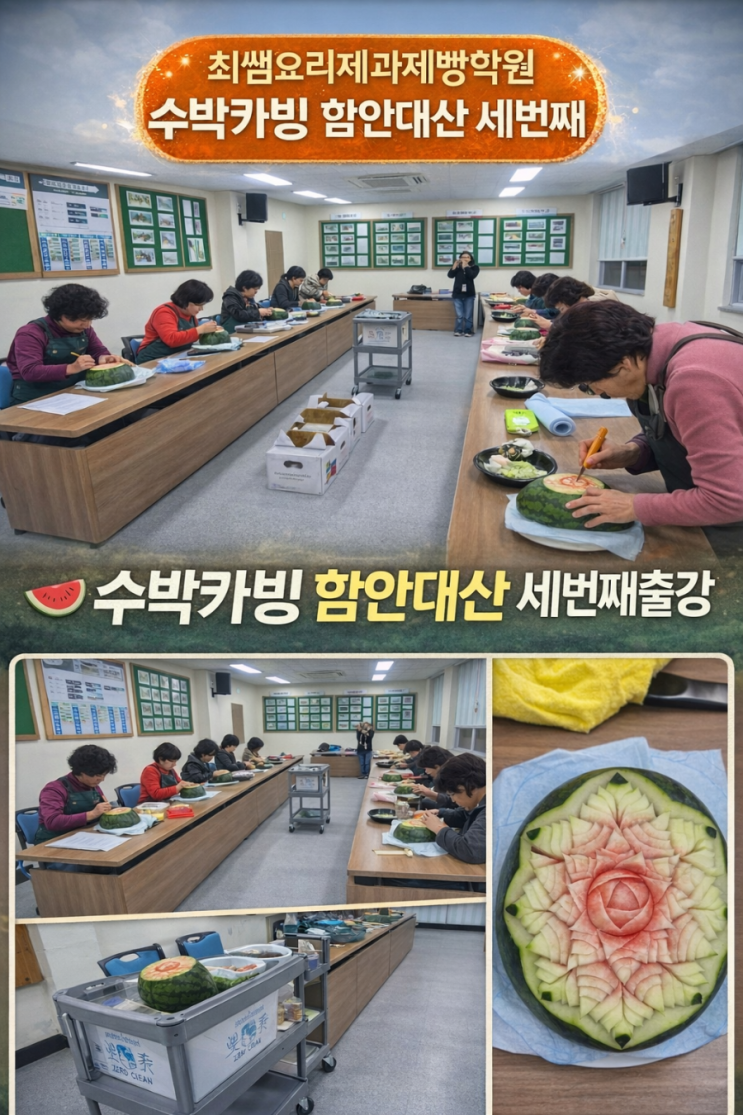 안녕하세요~~ 최쌤입니다. 오늘은 함안 대산에서 진행된 출강 수업, 벌써 3번째 시간 이야기를 기록으로 남겨보려고 합니다. 진주요리학원, 진주제과제빵학원으로 수업을 진행하다 보면 이렇게 지역으로 직접 찾아가 함께 배우는 출강 수업이 정말 의미 있게 느껴질 때가 많아요. 이번 수업은 경남수박카빙 과정 중에서도 난이도가 있는 카빙 수업이었습니다. 사진에서도 보이듯이, 넓은 강의실에서 각자 자리를 잡고 수박을 앞에 두고 집중해서 작업하는 모습이 인상적이었어요. 처음엔 다들 “이게 될까?” 하는 표정뿐 아니라 늘 호응 좋으신 우리 수강생 분들~~ 칼을 잡는 자세부터 선 긋는 법, 깊이 조절까지 하나씩 따라오시다 보니 분위기....... <img src="https://blogthumb.pstatic.net/MjAyNTEyMjdfMTQx/MDAxNzY2NzY3MDM0ODgy.wRwKNzHrzierqliH-briB8-Ecf43scPqsXr-NM7rC8kg.zFcvjuHtf4JTHIcg4PC83ePWZkmkPmhRx7475uYxnIwg.PNG/900%A3%DFfile%A3%DF00000000a6a472078e86ae376f0b2fc7.png?type=s3" />