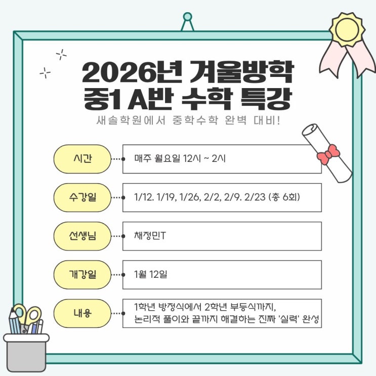 안녕하세요. 새솔학원 원장 김방희 입니다. 올 한해도 저희 새솔을 믿고 귀한 자녀를 맡겨주신 학부모님께 감사드리며, 열심히 따라와 준 우리 새솔프렌즈에게도 진심으로 감사드립니다. 새솔강사진은 추운 날씨지만 여름과 같은 뜨거운 열정으로 학습을 흐름을 겨울방학에도 쭉 이어갈 수 있도록 일주일 2번 수업에서 3번으로 늘려 진도를 충분히 나갈 수 있는 시간을 마련하였습니다. 중등부도 겨울방학 예습을 필요한가요? 네~ 필수입니다. 학년 전체 예습을 하면 가장 좋겠지만, 1학기 과정만이라도 시간을 갖고 개념이해와 응용및 심화과정을 공부할 유일한 시기입니다. 미리 한 번, 두 번씩 정리된 내용을 가지고 3월에 학교 수업에 임한다....... <img src="https://blogthumb.pstatic.net/MjAyNTEyMjdfMzUg/MDAxNzY2NzY0ODY0ODQ0.EQZKJl2dZ1w4D47SkLBPkvz24wwqRtkSWtYOLBMuUV8g.ntQX978UJzoHKmYN8iL-EdzsOUKIbI1YmxNgDhQf9DYg.JPEG/%C1%A6%B8%F1%C0%BB_%C0%D4%B7%C2%C7%D8%C1%D6%BC%BC%BF%E4._%282%29.jpg?type=s3" />