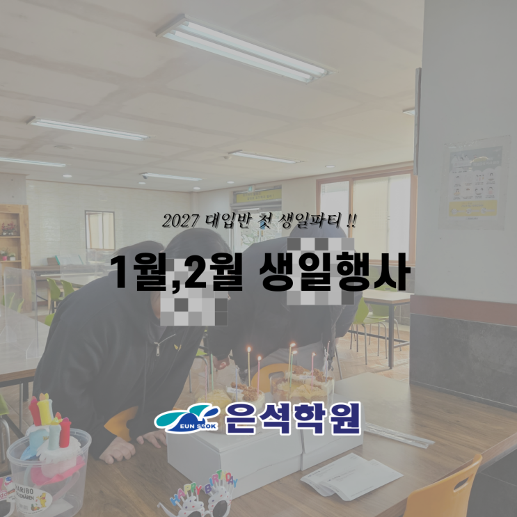 안녕하세요! 김해에 위치하고있는 재수기숙학원 은석학원입니다. 오늘은 저희 2027학년도 대입반 학생들의 1월, 2월 생일자 이벤트 현장을 소개해 드리려고 해요! 12월부터 2월까지 은석학원에 입소한 시기는 조금씩 다르지만, 서로에게 익숙해지며 함께 웃는 모습들이 늘어나고 있어요. 기숙학원 생활 중에도 생일은 그냥 지나칠 수 없죠? 정성껏 준비한 따뜻한 생일 파티 현장, 함께 보시죠! 주문제작 케이크와 생일상으로 당충전 완료! 생일을 맞이한 학생들을 위해 은석학원에서는 맞춤형 생일 케이크와 영양만점 생일상을 준비했어요! 이날만큼은 다 같이 웃으며 "생일 축하합니다~ " 노래도 부르고, 맛있는 케이크도 나눠 먹....... <img src="https://blogthumb.pstatic.net/MjAyNjAyMDVfMTA5/MDAxNzcwMjY0ODY2Mzg0.aSxpV87vtcoOA6NJk8-FEPBuPNHmyWPNtC-oa2vT09Ug.1D4adBE2ngIeVRR5RjIe30DSmpagwhrgh-srNz1b_JIg.PNG/%C1%A6%B8%F1%C0%BB-%C0%D4%B7%C2%C7%D8%C1%D6%BC%BC%BF%E4_-001.png?type=s3" />