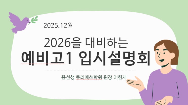 2026 예비고 입시설명회에 와주신 모든분들께 감사드립니다. 좋았던 점, 더 듣고 싶었던 점 등 편하게 댓글로 남겨주세요! 여러분의 이야기가 더 좋은 정보를 준비하는데 큰 힘이 됩니다. <img src="https://blogthumb.pstatic.net/MjAyNTEyMDVfMTA5/MDAxNzY0OTIwOTk3MjQw.QhtDCPwQUDBRXwv33neaX3jsi2GDozidAnqkBN5HzDog.Qpf0KaKTJU8Pses_CIXLMLwjootebAH3cft3VCcHg6wg.JPEG/4444.jpg?type=s3" />