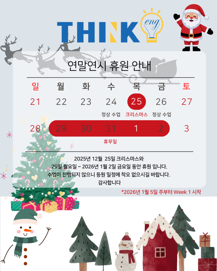 ✨ 안녕하세요, 띵킹 어학원입니다 다가오는 12월 연말연시 휴원 안내드립니다. 12/24(수) 정상 수업 12/25(목) 휴원 12/26(금) 정상 수업 12/29(월) ~ 2026/1/2(금) 휴원 2026년 1월 5일(월)부터 Week 1 시작 항상 함께해주시는 학생 및 학부모님께 감사드리며, 일정 참고하시어 등원에 착오 없으시길 바랍니다. 연말이 성큼 다가온 만큼, 올 한 해 마무리도 따뜻하고 평안하게 보내시길 바랍니다. 새해에도 더 성장하는 모습으로 만나 뵙겠습니다 ✨ <img src="https://blogthumb.pstatic.net/MjAyNTEyMDVfMjQ0/MDAxNzY0OTIxNzQ4ODg1.iHt3IBM28UnN3HnKrJhNj1OWKpKyrAXRnihtUJZ0kT4g.5vkrDYPoDJvEKObJaB0m27QGaJL0y8LQHZgANBB56EAg.PNG/%B6%F2%C5%B7%C8%A8%C6%E4%C0%CC%C1%F6_%BF%AC%B8%BB%BF%AC%BD%C3_%C8%DE%BF%F8%BE%C8%B3%BB_.png?type=s3" />