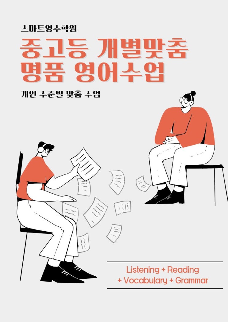 안녕하세요 스마트영수학원입니다 중·고등 영어 학습에서 중요한 것은 학생마다 다른 수준과 속도를 정확히 파악하는 것입니다. 오늘은 우리 학원의 개별맞춤 명품 영어수업이 어떻게 진행되는지, 실제 수업 현장을 통해 소개해드리겠습니다. 학생마다 다른 속도, 다른 방식 그래서 우리 학원은 ‘맞춤형 영어 수업’을 합니다 공부는 과목을 떠나 학생마다 이해 속도와 학습 방식이 모두 다릅니다. 같은 설명을 들어도 금방 이해하는 학생이 있는 반면, 조금 더 천천히 반복이 필요한 학생도 있죠. 그래서 우리 학원은 수학과 영어 모두 단체 판서식 수업이 아닌, 학생 개개인에 맞춘 맞춤형 수업을 기본으로 운영하고 있습니다. 선생....... <img src="https://blogthumb.pstatic.net/MjAyNjAyMDRfMTI3/MDAxNzcwMTkwMzIyOTQ0.lHKyURdigPja9y70NHjz6WVdkYxjgPFnM_dp4uZu2Kog.UwVylEGrIXTzqK3nX6AjL9cfWUiMK9_nC7jfArEKm5Ug.JPEG/%BF%B5%BE%EE%BC%F6%BE%F7_%BA%ED%B7%CE%B1%D7_%C7%A5%C1%F6.jpg?type=s3" />