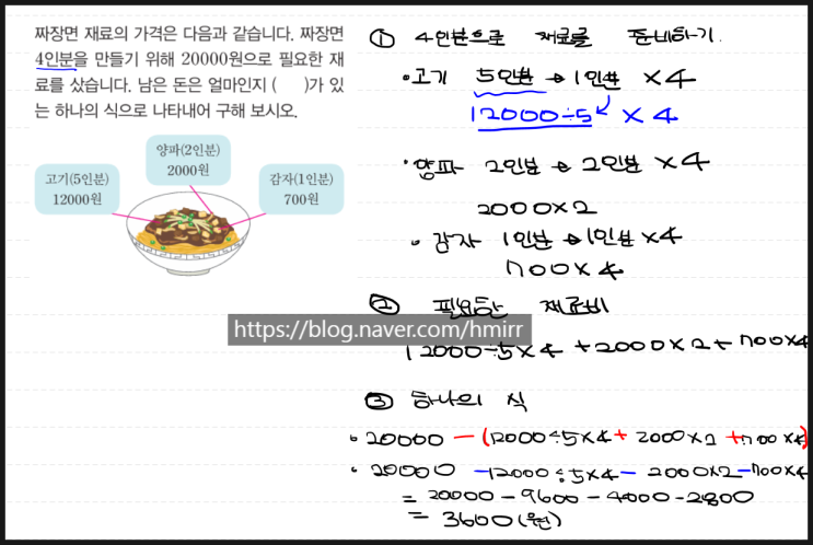 안녕하세요. 오늘은 5학년 1학기 1단원. 자연수의 혼합계산 활용 중 많이 나오는 2문제를 갖고 왔습니다. 교과서에서 카레 문제로 많이 등장하는 문제입니다. 혼합계산 단원에서는 하나의 식으로 표현하는 과정에서 문제에서 주어진 수들로 표현!! 즉 계산된 수들로 식을 쓰지 않게 주의해야 합니다. 두 번째 주의 사항은 식을 쓸 때 괄호를 칠 것인지 그렇지 않을 것인지에 따라 수식이 다르게 표현됩니다. 학생들이 많이 놓치는 부분이니 주의가 필요합니다. 이 문제는 학생들이 어려워하는 이유가 '등분한 것 중 한도막'에서 많은 혼란을 겪습니다. 그냥 한도막이고 나누기를 바꾸어 표현한 것뿐인데 "한도막으로 어떻게 표현....... <img src="https://blogthumb.pstatic.net/MjAyNjAzMjNfNTUg/MDAxNzc0MjQxOTY5NDE4.Q4T_8_pwEfMx5b5uTdX8-5Z2URc2OBj09pDtTUFJ5v8g.ZeuSS0cyG_u4kpVLpMJ8UE3LOb0HRsahkm21H2V_EPAg.PNG/%C8%A5%C7%D5%B0%D4%BB%EA_1.png?type=s3" />
