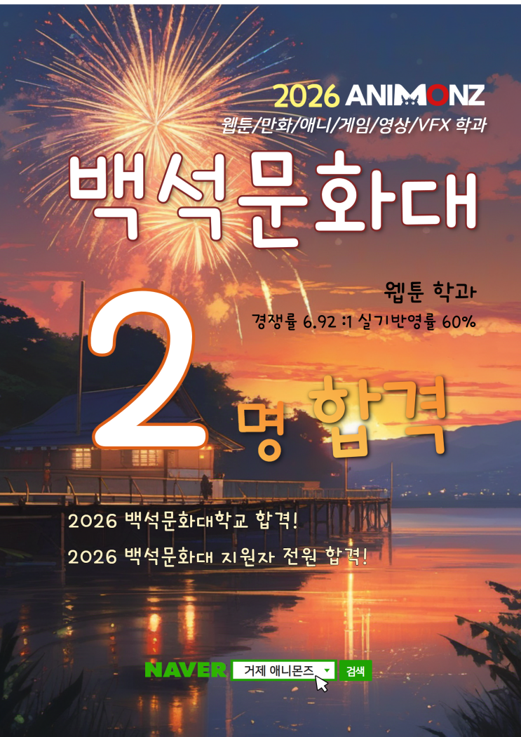 거제 만화/애니/게임/웹툰/VFX 입시전문 애니몬즈 만화학원 2026 백석문화대학교 합격 해마다 경쟁률이 올라가고 있는 백석문화대학교입니다. 합격을 진심으로 축하드립니다. 입시생! 학부모님! 모두 고생 많으셨습니다. 입시학원 선택의 기준은 합격결과 입니다. 합격결과로 증명하는 진짜 만화학원! 거제 애니몬즈 만화학원 애니몬즈 미술학원에는 거제 인근 지역의 많은 학생이 통학 수강하고 있습니다. 금/토/일 주말 수업의 확대로 통학생들의 충분한 수강을 지원하고 있습니다. <img src="https://blogthumb.pstatic.net/MjAyNjAyMDdfMTA0/MDAxNzcwNDU3MTQzNjEz.0NKw_0f0hEHDWPncGyuxzOna-kcB37WgZecoeAHXQJog.fo8pYuHcZjcMGfvdI_kBX6f2-aPa63Nrx-ynAUgMsQkg.PNG/%B0%C5%C1%A6%B9%CC%BC%FA%C7%D0%BF%F8_%BE%D6%B4%CF%B8%F3%C1%EE%B8%B8%C8%AD%C7%D0%BF%F8_2026%C7%D5%B0%DD_%B9%E9%BC%AE%B9%AE%C8%AD%B4%EB%C7%D0%B1%B3.png?type=s3" />