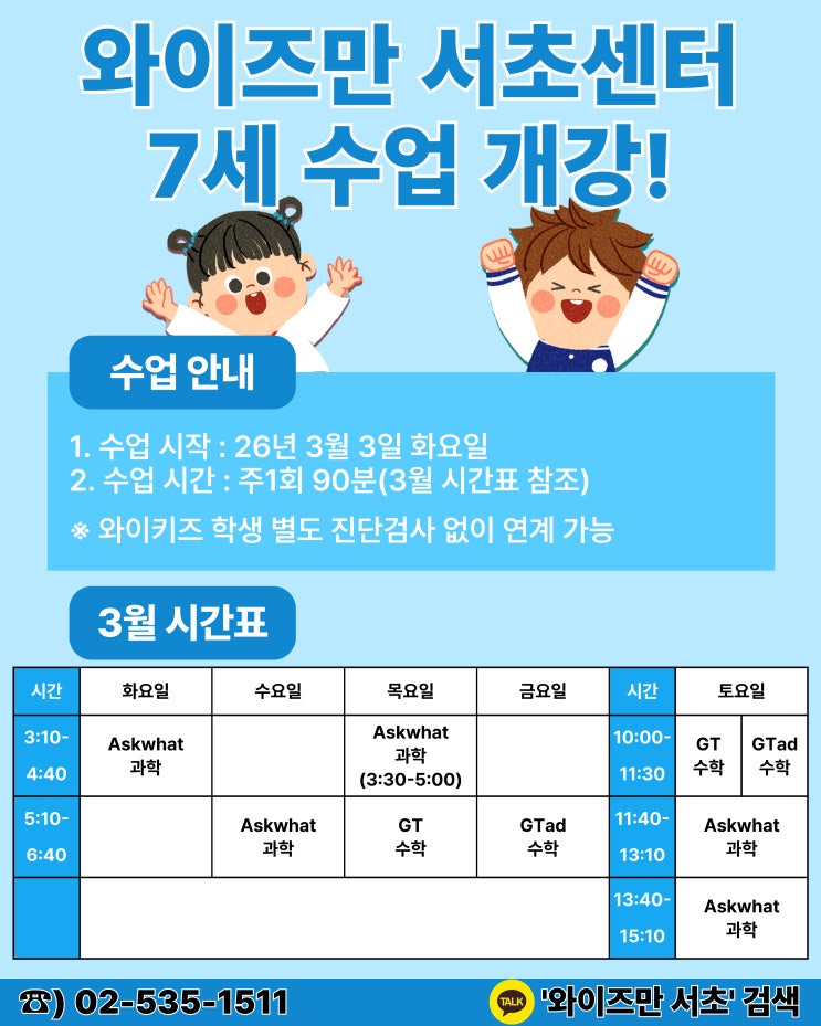 와이즈만 서초센터 3월 7세 수학 · 과학반 신규 개강 안내! 안녕하세요 와이즈만 서초센터입니다^^ 2026년 3월부터 7세 학생들을 대상으로 수학 · 과학 수업을 개강합니다! 수업은 주1회 1시간 30분씩 진행되며 4주 - 1달 단위로 이루어지게 됩니다. 단순 연산 혹은 책읽기가 아닌 탐구 수업을 시작하는 것으로 초등학교 진학 전 융합 인재로 성장할 기초를 다질 수 있습니다. 와이즈만 서초센터와 함께 창의적, 복합적 문제해결력을 가진 인재로 성장하는 기회를 가져보세요! 와이즈만 서초센터 < 7세 수학 · 과학 수업 개강! > ※ 3월 3일 화요일부터 개강! ※ 반별 6명 선착순 모집! 1. 사고력 수학 수업 * 시간표 * ① GT 수학 프로그....... <img src="https://blogthumb.pstatic.net/MjAyNjAxMzBfMTgx/MDAxNzY5NzU2Njc5NTgy.1xnfzv_nCPfmZRRQBYAMD22bdBpXDIfirCfIobe_e08g.Rol3JztM1uqC4tBm5Vwz5G2-WJL7C1m_Dsijg-p3A18g.JPEG/3%BF%F9_7%BC%BC%B0%B3%B0%AD%B9%DD_%C6%F7%BD%BA%C5%CD.jpg?type=s3" />