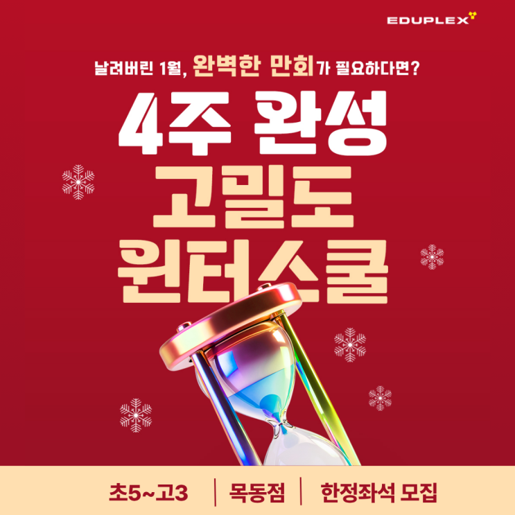 “방학하고 윈터 알아보는데 너무 늦었을까요?” “두 달 풀로 보내기엔 일정도 비용도 부담이에요.” “부족한 것만 딱 정리하면 될 것 같은데…?” 이런 고민으로 망설이시는 학부모님들께, 목동 에듀플렉스가 준비한 해답이 있습니다. ❄️ 4주 완성 고밀도 윈터스쿨 ❄️ 시작일/시간표/커리큘럼 모두 학생 맞춤으로 진행되기 때문에 1월에 들어와도 4주 동안 목표를 충분히 달성할 수 있어요! 좌석 제한적으로 운영 중이니 빠르게 상담신청 남겨주세요! 어떻게 4주 완성이 가능한가요? 핵심은 구조가 다릅니다 많은 학원에서는 정해진 시간표 + 정해진 진도를 따라가게 됩니다. 그러면 아이 입장에서는 ‘나에게 부족한 것’보다 학원 진....... <img src="https://blogthumb.pstatic.net/MjAyNjAxMTVfNjIg/MDAxNzY4NDQ0NjgyMTg0.sxstyFd3_Y-u7nz71v156VJP_vpbJ-6yQfTwS_snyawg.nPlBwXybBdPioD5YCJmVmtSmAGVi8szyKsxV914QDf4g.PNG/%C1%A6%B8%F1%C0%BB_%C0%D4%B7%C2%C7%D8%C1%D6%BC%BC%BF%E4._%2833%29.png?type=s3" />