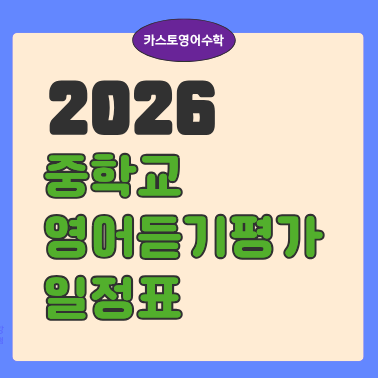 안녕하세요? 남양카스토영어수학입니다. 2026학년도 전국 시·도 교육청 공동 주관 중학교 영어듣기능력평가 일정입니다. 올해는 1학기와 2학기 각각 학년별로 날짜가 지정되어 있으니 미리 확인해 두세요. 시험보시기 전에 연습해보시라고 2025년 듣기평가 1회 기출자료를 공유합니다. 2025년 1학년 1회 듣기평가 기출문제와 답 mp3음원 2025년 2학년 1회 듣기평가 기출문제와 답 mp3음원 2025년 3학년 듣기평가 기출문제와 답 mp3음원 카스토영어학원 - 네이버지도 <img src="https://blogthumb.pstatic.net/MjAyNjAzMjdfNzEg/MDAxNzc0NTk3ODEzMDQ2.8c59v_nPH9ExRK0AnspYhMmG7fAbAN52QZs2zR3SQeAg.4-9j7AS48yUsZkPy-Tk-YLIhoMVVDDmVNeQmJ_GXB70g.PNG/%C1%A6%B8%F1%C0%BB_%C0%D4%B7%C2%C7%D8%C1%D6%BC%BC%BF%E4._%2815%29.png?type=s3" />