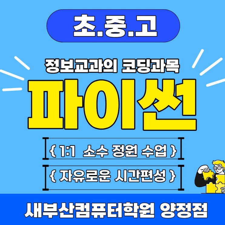 안녕하세요 새컴지기입니다 요즘 학부모님들과 상담을 하다 보면 “코딩이 중요하다고는 하는데, 언제부터 시작해야 할까요?” 이런 질문을 정말 자주 듣게 됩니다 4차 산업혁명, AI, 데이터, 미래 직업 이야기까지 어디서나 코딩 이야기가 나오다 보니 괜히 뒤처지는 건 아닐까 걱정이 되는 것도 사실이죠 하지만 한편으로는 “우리 아이가 잘 따라갈 수 있을까?” “너무 어려워서 금방 흥미를 잃지는 않을까?” 이런 마음도 함께 드는 게 자연스럽습니다 그래서 오늘은 초등부터 고등까지, 왜 파이썬(Python) 코딩 교육이 좋은 선택인지 이야기해보려고 합니다 초중고 코딩 교육, 왜 파이썬(Python)인가요? 최근 초중고 코딩 교육에....... <img src="https://blogthumb.pstatic.net/MjAyNjAxMDRfNTcg/MDAxNzY3NTE2OTgxMDk0.U9vxlnpRVeK0k5_zQmYK5KCthUvv-_a10jxa-ExVtRIg.-XtSB0gAVRPUDUol_Vzb6g2JsildIQzEzDoXGE26Zngg.JPEG/%C6%C4%C0%CC%BD%E3.jpg?type=s3" />