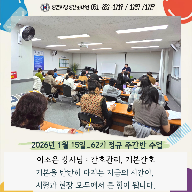 안녕하세요. 정연화 양정 간호조무사 학원입니다. 1월 15일(목)에는 간호조무사 과정에서 각 기수별로 실무와 이론의 균형을 맞춘 수업이 진행되었습니다. 국가고시 대비는 물론, 현장에서 꼭 필요한 기본 역량을 차근차근 다지는 하루였습니다. 62기 주간반 수업 이야기 62기 주간반은 이소은 강사님과 함께 간호관리와 기본간호 수업을 진행했습니다. 간호조무사로서 반드시 이해해야 할 업무 흐름과 기본 간호 원칙을 중심으로, 실제 현장에서 어떻게 적용되는지를 사례와 함께 짚어보는 시간이었습니다. 64기 주간반 수업 이야기 64기 주간반은 옥륜 강사님과 함께 간호관리, 기초약리, 기초영양 수업을 이어갔습니다. 약물과 영양....... <img src="https://blogthumb.pstatic.net/MjAyNjAxMTVfNjkg/MDAxNzY4NDc3NDU3NTQ4.rYAogQCduyNjclqW4sAbidjTqzsu0nwfjVipkW3JmTEg.PVb09hIwWjYFItq46JrUzOc8gM9d-XRkRVpZ0Y9pOgsg.PNG/62.png?type=s3" />