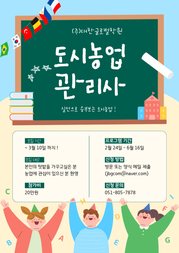 2026년 도시농업전문가 양성 과정 모집 공고 한국 도시농업 관리사협회에서는 도시농업의 육성 및 지원에 관한 법률에 의거, 도시농업관리사 필수 이수 과정인 『도시농업 전문가 양성 과정』 교육 대상자를 아래와 같이 모집합니다. 2026. 02.24.(화) 19시 00분 선착순 마감(입금순)30명 개강일 : 2026. 02.24.(화) 19시 00분 – 개강일 입학 오리엔테이션 장소 < 주소 > 부산광역시 부산진구 중앙대로 760 (주)대한글로벌 3층 교육기간: 이론 40시간 : 2026. 02.24. ~ 06.16 매주 (화, 목) 19:00 ~ 22:00 실습 40시간 : 2026. 03.14. ~ 06.13 매주 (토) 10:00 ~ 15:00 교육장소 이론 : 한국도시농업관리사협회 부전동 교육장 실습 : 한국....... <img src="https://blogthumb.pstatic.net/MjAyNjAzMzBfMTk0/MDAxNzc0ODU1MjI1MTcz.9vM378-bBaToSEhEZCE1eLrs_NArmHozNeI9EbXXesIg.-iNKqyjgqczy-D5C_Hb24lCqtr6VGw2s7HleYAlcL-0g.PNG/%B5%B5%BD%C3%B3%F3%BE%F7_%B0%FC%B8%AE%BB%E7.png?type=s3" />