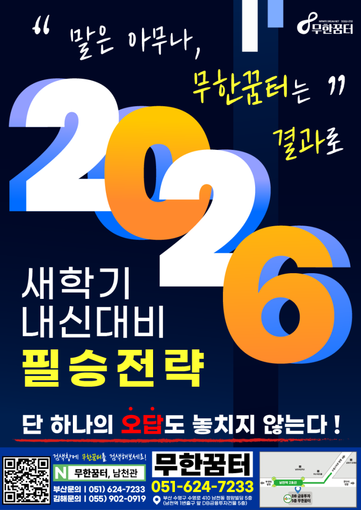 2026 새학기 내신대비, 지금부터 시작입니다! “ 말은 아무나, 무한꿈터는 결과로 ” 안녕하세요, 무한꿈터 남천관 입니다. 2026년 새학기가 시작되면서 학생들의 내신 경쟁도 함께 시작되었습니다. 많은 학생들이 “시험은 아직 멀었으니까…” “조금 있다가 준비해도 되겠지…” 라고 생각하지만 실제로는 지금부터 준비한 학생들이 중간고사에서 결과를 만듭니다. 특히 중·고등학교 내신은 단 한 문제 차이로 등급이 달라지기 때문에 평소 관리와 준비가 가장 중요합니다. 무한꿈터는 단순히 문제만 많이 푸는 수업이 아니라 학생들의 실력을 체계적으로 관리하는 시스템 수업을 진행합니다. ✔ 학교별 시험 범위 맞춤 내신 대비 ✔....... <img src="https://blogthumb.pstatic.net/MjAyNjAzMDRfMTIw/MDAxNzcyNjMwNzYwMjMw.1MfL5u1nctxD8kVGvIwqmFI6nHHa4ZqFRNTqAnQe6TMg._0w6W_jEkX2kKSjwA3Zy7irG_BF0apHK5vXZ3Y4sSiog.PNG/26%B3%E2_%B0%B3%B0%AD_%C6%F7%BD%BA%C5%CD_%B3%B2%C3%B5.png?type=s3" />