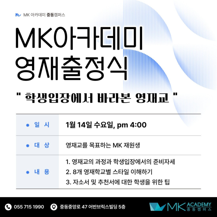 안녕하세요? 창원 중동 MK아카데미학원입니다. 영재교를 목표하는 재원생을 대상으로 「MK아카데미 영재 출정식」을 진행합니다. 일시 1월 14일(수) 오후 4:00 대상 영재교를 목표하는 MK 재원생 주요 내용 - 영재교 과정과 학생의 준비 방향 - 8개 영재학교별 스타일 이해 - 자소서·추천서 관련 학생을 위한 핵심 팁 신청링크 https://forms.gle/fpfxsdYR55yKEi556 영재를 목표로 하는 학생들에게 꼭 필요한 설명회이니 많은 참여 바랍니다. 감사합니다. MK아카데미 중동캠퍼스 프로그램 문의 및 신청 ☎ 055 715 1990 ☎ 010 8215 7900(수납) ☎ 010 4227 7901(상담) [카톡 아이디 : mk7151990] (창원시 의창구 중동중앙로....... <img src="https://blogthumb.pstatic.net/MjAyNjAxMTJfMTEg/MDAxNzY4MTk0ODY1NDk4.N9OGly5SdMJGeWuKgz3bi6qfjDe0FpxUVp9N03N7DSQg.4LJjh4ngMxHT8gMIMxvUxTrQ-6W3xmdwfPjx0Pc4VWgg.PNG/image.png?type=s3" />