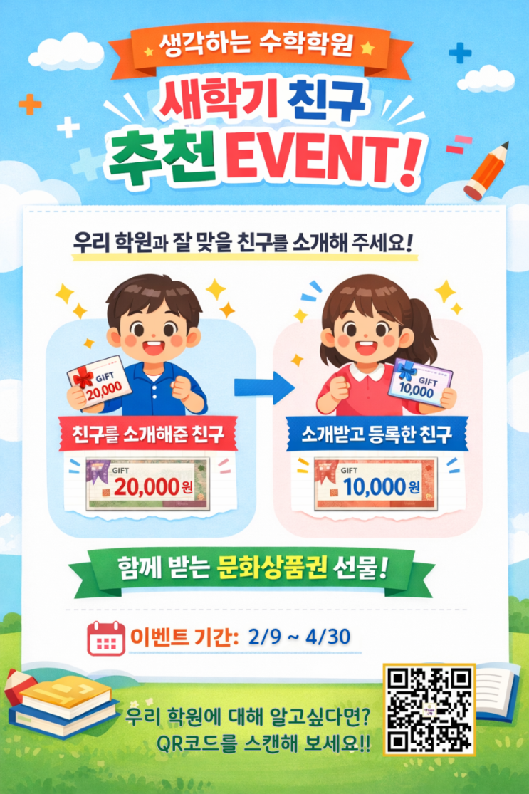 새학기 이벤트~!! 친구를 소개하고 문화상품권 선물 받자!! 학원은 올바른 교육철학을 가지고 그것이 학부모님의 교육관과 잘 맞는 것이 중요하고 무엇보다 모든 에너지를 우리 학생들에게 쏟아야 하기 때문에 일회성 이벤트는 잘 하지 않는 편입니다. 하지만 유독 우리 학원은 저희 교육방식을 믿고 지지해 주시는 학부모님들께서 소개를 많이 해주시는 편이라 보답과 감사의 마음을 담아 새학기 맞이 이벤트를 준비하였습니다!! 주위 친구에게 우리 학원을 소개하고 그 친구가 학원 등록 시, 소개한 친구에게 문화상품권 2만원, 소개받은 친구에게 문화상품권 1만원을 증정합니다!!! 우리 학원의 교육방식을 널리 알려주시고 그와 더불어 책 한....... <img src="https://blogthumb.pstatic.net/MjAyNjAyMDZfMjkg/MDAxNzcwMzM4NzQxNzcz.f1Gif51UfTCl1pScZDwgFcz3ts54TSXUQsRzQT9tA3Eg.uQSws-qHEFm3seMsFv522uZgbFJAAl0kYOH8VewEjCcg.PNG/900%A3%DF%BF%F8%A3%DF20260205%A3%DF141944%A3%DF0000.png?type=s3" />
