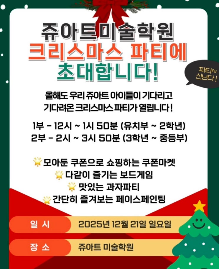 2025 쥬아트 크리스마스 파티 2025.12.21 (일) 올해도 아이들이 손꼽아 기다리던 쥬아트 미술학원 크리스마스 파티를 진행했습니다. 올해는 1부와 2부로 나누어 진행된 파티는 준비부터 마무리까지 정말 정신없이 흘러간 하루였지만, 그만큼 웃음과 에너지로 가득 찬 시간이었습니다. 쿠폰 마켓, 과자 파티, 보드게임, 페이스 페인팅까지 아이들이 직접 참여하고 즐길 수 있는 활동들로 학원 곳곳이 웃음소리와 설렘으로 채워졌습니다❤️ 평소 수업 시간에는 집중해서 작업하던 아이들이 이날만큼은 친구들과 어울리며 마음껏 웃고 뛰노는 모습으로 또 다른 매력을 보여주었습니다. 그 모습을 지켜보며 저희에게도 참 감사하고 따뜻한....... <img src="https://blogthumb.pstatic.net/MjAyNTEyMjJfMTc0/MDAxNzY2Mzc1ODA0MjA4.5aPiZP3litQwo3C-QzLpQAz_zefdEIhMbJpsONrVjqIg.-fjenCCcWOLeKrFHH8_fD1u8o_jCkdG0p1GbcjuHztsg.JPEG/IMG%A3%DF0751.jpg?type=s3" />