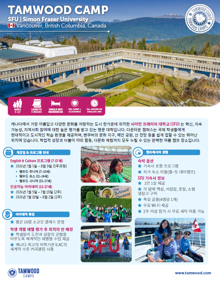 캐나다 영어캠프 추천 – 밴쿠버 템우드 영어캠프 (SFU / UBC 캠퍼스) 여름방학을 활용해 캐나다 영어캠프를 고민하는 학부모님들이 많습니다. 특히 안전하고 교육환경이 좋은 밴쿠버 대학 캠퍼스 영어캠프는 매년 인기가 높습니다. 오늘 소개해 드릴 프로그램은 캐나다 밴쿠버에서 진행되는 Tamwood(템우드) 영어캠프입니다. 템우드 캠프는 30년 이상 운영된 국제 영어캠프로 전 세계 학생들이 참여하는 프로그램이며 밴쿠버의 대표 대학 캠퍼스인 Simon Fraser University University of British Columbia 두 곳에서 진행됩니다. 대학 캠퍼스에서 생활하며 영어수업 + 액티비티 + 문화체험을 함께 경험하는 프리미엄 캐나다 영어캠프 프로그램....... <img src="https://blogthumb.pstatic.net/MjAyNjAzMTJfMTk0/MDAxNzczMzExMjI2OTA4.UsIp4rOBUFmCtHy0gjjK4FvwR9Y91BLvkWXT3Ga05G8g.UjTDKE4-sVRUegWCGEPOlcOFlC5p8kI00P941cE_G2Mg.PNG/image.png?type=s3" />