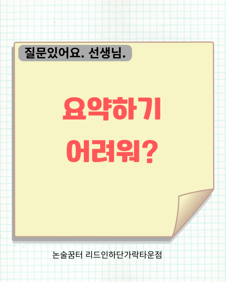 Q. 요약하기가 어려워요. 어떻게 시켜야 하나요? 요약은 단순히 글을 줄이는 연습이 아닙니다. 학년에 따라 ‘요약의 목적’ 자체가 완전히 달라집니다. 그래서 요약은 한 가지 방식으로 계속 시키는 활동이 아니라 학년별로 다르게 접근해야 하는 읽기 훈련입니다. 초등 요약하기 방법 (이해 확인 중심) 초등 요약의 목적은 ‘잘 줄이는 것’이 아니라 ‘제대로 이해했는지 확인하는 것’입니다. 문장력보다 이해가 먼저입니다. ✔ 초등 요약 원칙 길게 쓰게 하지 않습니다 문장 수보다 내용 파악을 봅니다 [학년별 방법] 초1~2학년 “누가 나왔어?” “무엇을 했어?” 한 문장으로 말하거나 적기 초3~4학년 (중심 문장 찾기) “이 글....... <img src="https://blogthumb.pstatic.net/MjAyNjAxMjlfMzAw/MDAxNzY5Njc2MDAzNDc5.sKngNvq6h5rGcF8K7pR9obhlW54VcnyFWG5SaCDhHCwg.VTkfwtAMBztGYMLj27jH7_nONkBRYDTXDSTIc0CtdpUg.PNG/17.png?type=s3" />