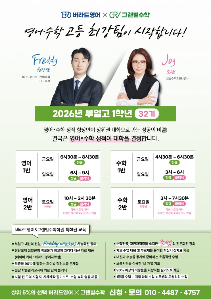 안녕하세요 감천동 영어 수학학원 버라드&그랜빌입니다 오늘은 부일고 32기 1학년 1학기 영어와 수학 시간표에 대해서 알려드리려고 합니다 영어와 수학 따로 수강 가능합니다 각 각 버라드 영어학원 시간표와 그랜빌 수학학원 시간표입니다 학생들은 시간표를 잘 기억해두고 자신의 수업 시간에 잘 참여하도록 해주세요!! 저희 버라드&그랜빌 학원이 학생들의 성적을 올리기 위해 하는 방법이 궁금하지 않으신가요?? 버라드만의 비결 3가지 1️⃣ 증명된 자료의 퀄리티 2️⃣ 수없이 많은 수강 후기 3️⃣ 백발백중 시험 문제들 저희 학원은 주변 많은 학원들 사이에서도 많은 자료를 가지고 있는 학원으로 유명합니다 영어 공....... <img src="https://blogthumb.pstatic.net/MjAyNjAyMTFfNDYg/MDAxNzcwODAxMDExMzkx.IZrLrtB8KnKXzOJ0e1Y3pBRp0EaX9XXI5hXveTpSRuIg.AAM2NZM76bprqmKOKa_Nm9vGbbYmK7cvsl4FKPlmcXAg.JPEG/1.-26%B3%E2-%BA%CE%C0%CF%B0%ED-%BF%B5%BE%EE-%BC%F6%C7%D0-%BD%C3%B0%A3%C7%A5-1%C7%D0%B3%E2%2832%B1%E2%29.jpg?type=s3" />