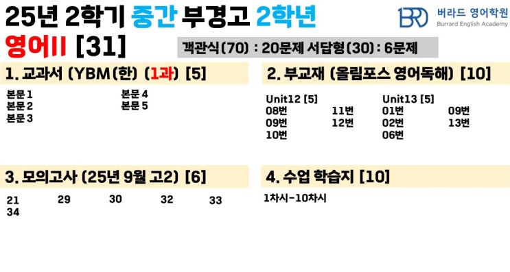 안녕하세요 감천동 영어 수학학원 버라드&그랜빌입니다! 현재 저희 학원은 외고 자사고뿐만 아니라 주변에 위치한 다양한 학교들을 집중적으로 케어하고 있습니다 ✌️ 오늘은 2025학년도 부경고 2학년 2학기 중간고사 영어II 시험을 분석해 드리고 자 합니다! 이번 영어II 시험 범위입니다! 이번 시험에서는 객관식 총 20문제 서술형 총 6문제가 나왔습니다 부교재와 수업학습지의 문제 출제 비율이 가장 높으며 어휘 유형의 문제가 가장 많이 출제가 된 것을 알 수 있습니다 단어와 글의 흐름이 중요했을 시험이었을 것 같습니다!! ⭐ 부경고의 기말고사 특징 ⭐ 부경고 2학년 시험 특징은 부교재의 비중이 가장 높다는 것입니다 ....... <img src="https://blogthumb.pstatic.net/MjAyNTEyMjhfMjg3/MDAxNzY2OTEyNjYxOTU4.6YPT4J2B7wglMUkWr1iXXWunb6NWxUYHxxyAIs2BmP0g.g88wYIP9z4z2Dh6FjH5reN-qm3GtzOaDVbA1cuT9Xd0g.JPEG/2025%B3%E2_%BA%CE%B0%E6%B0%ED_2%C7%D0%B3%E2_2%C7%D0%B1%E2_%C1%DF%B0%A3%B0%ED%BB%E7_%BD%C3%C7%E8%B9%FC%C0%A7_%C1%A4%B8%AE_%C3%D6%C1%BE%B0%CB%C5%E4_%BC%DB%C7%F6%C1%D6.jpg?type=s3" />