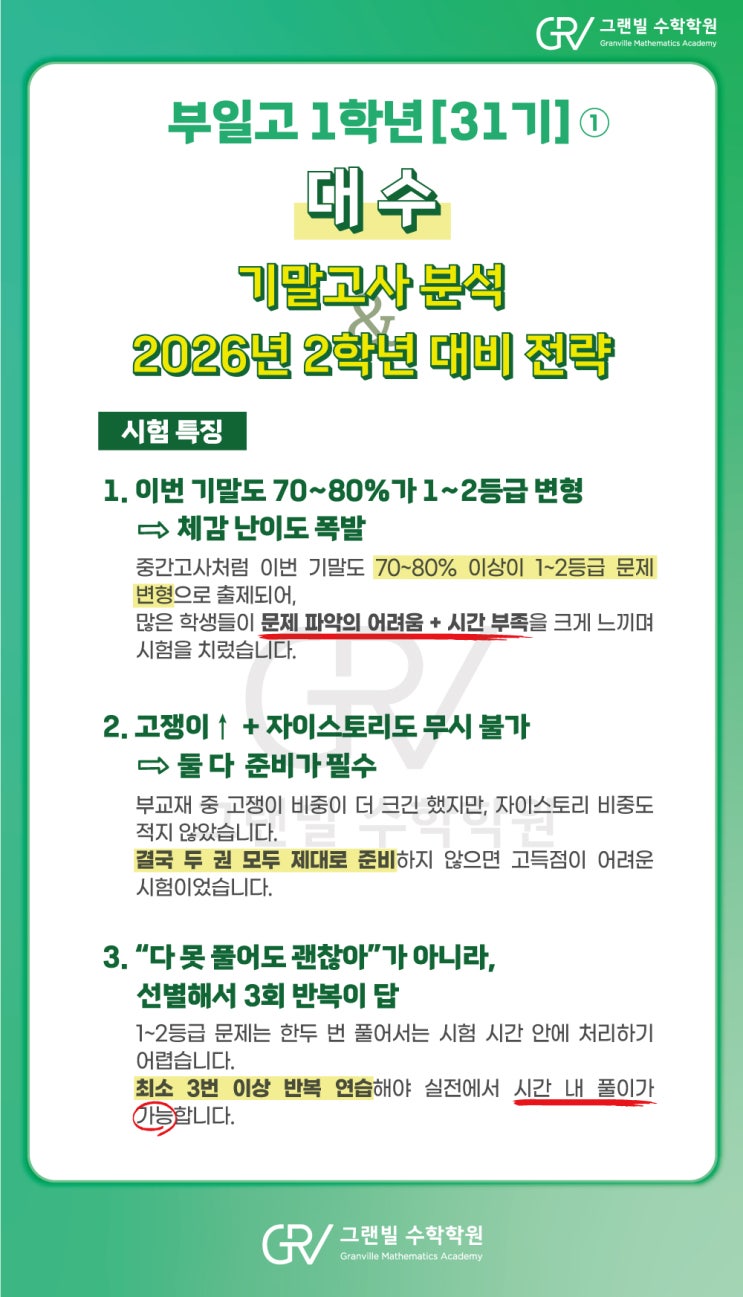 안녕하세요 감천동 영어 수학학원 버라드&그랜빌 입니다 오늘은 부일고 31기 1학년 2학기 기말고사 대수에 대한 분석을 알려드리고자 포스팅을 진행하게 됐습니다 2025년 1학년 2학기 기말고사 대수 범위 입니다 부일고의 부교재와 저희 학원만의 자체 제작 교재입니다 이번 시험에서는 객관식 총 15문제 서답형 총 5문제로 이루어져 있습니다 이번 기말고사도 중간고사처럼 70~80% 이상의 1~2등급 문제들이 변형되어 출제되었습니다 많은 학생들이 문제 파악의 어려움과 시간 부족 등을 느끼며 시험을 쳤습니다 부교재 중 고쟁이 비중이 좀 더 많기는 했지만, 자이스토리의 비중도 적지 않아서 부교재 두 권 모두 제대로 준비하지 않으면 고....... <img src="https://blogthumb.pstatic.net/MjAyNjAxMTJfMjkz/MDAxNzY4MjE2MzE0OTE0.-MNdO0jUqLLfT7haV6Rr2KX6TKtF34J0Kv19IbujJdYg.zfvEZ6QztcA_B7YXxg6Yshmd1fS0GzQxyohSiAxLwaAg.JPEG/260102-%B1%D7%B7%A3%BA%F4-%BC%F6%C7%D0-%BA%CE%C0%CF%B0%ED-%BD%C3%C7%E8%B9%AE%C1%A6-%C0%FB%C1%DF%B7%FC%281%C7%D0%B3%E2%29-%B4%EB%BC%F6-5.jpg?type=s3" />