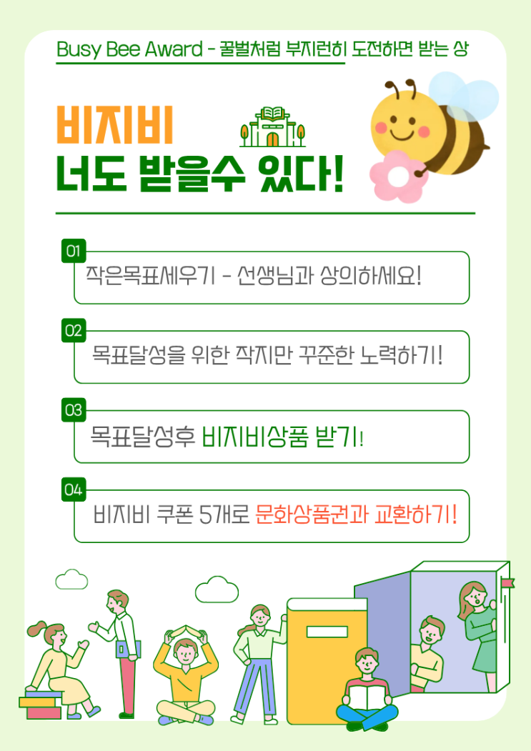우리아이의 어떤 작은 변화도 놓치지 않고 상주고 응원하는 학원, 이투이어학원입니다. 금정구영어학원 | 구서동 초등영어학원 | 구서동 중등영어학원 | 구서동 고등영어학원 선생님! 지난번 단어 50점 있었는데 이번에는 70점 받아볼께요! 이게 도대체 무슨말일까요? 이투이어학원 귀염둥이들이 Poptest시험에서 비지비상(Busy Bee Award)에 도전하겠다는 신호입니다^^ 비지비상은 각자 성장을 위해 필요한 작은 목표를 세우고 작은 변화를 만들어가는 과정을 칭찬하고 응원하는 상입니다 예를 들어 70점은 누구인가에게는 여전히 낮은 점수이지만 50점을 받는 학생이 지속적인 70점을 유지하는 것은 변화의 시작이므로 칭찬과 응원을 받아요! 도....... <img src="https://blogthumb.pstatic.net/MjAyNTEyMjZfMjQy/MDAxNzY2NzIwOTU5MDY4.NSyiPV4HgW0G1HLj0c09bUGfSx7H027Sd177jTljvp8g.QIMCICad2BfTmXxSFqUATxv6Jxs9JpGySU4v9TTkOnsg.PNG/%BA%F1%C1%F6%BA%F1%BB%F3_%BC%B3%B8%ED_%281%29.png?type=s3" />