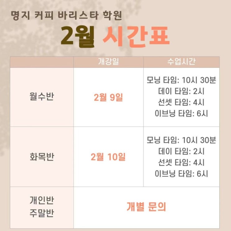 ※명지 커피바리스타학원 2월 자격증반 수업일정 안내※