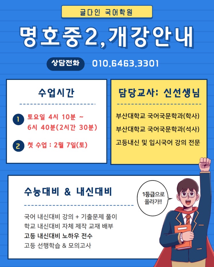 26년도 명호중 2학년 토요일반은 이미 마감이 되었으나, 토요일 수업을 듣고자 대기하는 학생이 많아.. 토요일 4시 10분 수업을 추가로 개설합니다. 첫 수업은 2월 7일(토), 4시 10분 입니다. 수업시간은 2시간 30분입니다. 학생의 스케줄을 고려하여 수업이 가능한 시간이라면 상담 예약을 하신 후, 대표자에게 구체적인 커리큘럼 안내를 받으시면 됩니다. 최종 등록 여부는 대표자와 상담 후, 원 내 학습 환경과 구체적인 커리큘럼 등을 평가한 다음 결정하시면 됩니다. 상담 예약은 문자 또는 전화문의 부탁드립니다. <img src="https://blogthumb.pstatic.net/MjAyNjAxMTdfMTE5/MDAxNzY4NjQ2MDMwNzYy.W7OD0ZPzWm73C4otU8TvFXefpB57oW4-IoGH6-iEpDAg.nmFHqLGqCbMjfg2H0rGO37lp_epi76ugxFxJsrQM9jcg.JPEG/%B8%ED%C8%A3%C1%DF2%B0%B3%B0%AD%BE%C8%B3%BB.jpg?type=s3" />