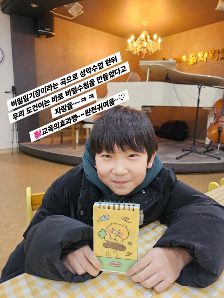 등록한지 1달도 안된 피아노랑 성악 수업을 받는 도건이의 센스~♡ "비밀일기장"이라는 곡으로 성악수업 한뒤 우리 도건이는 바로 "비밀수첩"을 만들었다고 자랑을 귀엽게 했다~ 하원을 맞이하러 오신 어머님께 도건이 센스가 멋지다고 했더니 ~원장선생님 똑같은곡을 1시간 들어보셨어요?~ 하신다. 나는 그 얘기를 듣는 순간!!!! 얏호~!!! 성공이다. 음악을 평생 사랑하고 좋은친구가 되겠다는 확신이 들었기 때문이다. 우리 지금처럼 즐겁게 수업하자 도건아~♡♡♡ <img src="https://blogthumb.pstatic.net/MjAyNjAyMDRfMTE2/MDAxNzcwMTY4NzEyNzk0.NXMwi9zV5M9_JQKFz7qO3Wi9vzYfeSbJs9Uf3_inaykg.gc5swpAnVQBw0AMB4QePiv2TaOnhyFKXwNUg2WXYUsAg.JPEG/900%A3%DF20260203%A3%DF175629.jpg?type=s3" />