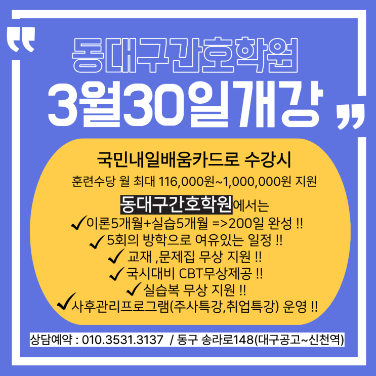안녕하세요 오늘은 즐거운 금요일~~ 대구간호학원 동대구간호학원의 DNA예요^^ 대구간호학원 동대구간호학원의 26년 봄학기 개강은~ 3월 30일 !!! 국비지원받아 또다른 내일을 위한 준비도 하고 공부하는 동안 훈련수당도 받고 .... 말그대로 일석이조의 효과를 볼 수 있는 국비직업훈련과정 간호조무사 자격 취득 과정입니다 ^^ 대구간호학원 동대구간호학원에서는 실무중심의 교육을 진행하면서 이론과목도 놓치지 않는 최고의 강사들로 이루어져있어 높은 합격률을 자랑합니다 ^^ 수료후 사후관리프로그램인 주사특강으로 주사에 대한 자신감 UP~ 취업특강으로 면접에 대한 자신감 UP ~!! 또 다른 내일을 위한 준비로 선택하지 않을 수 없는 동....... <img src="https://blogthumb.pstatic.net/MjAyNjAxMTVfMjk4/MDAxNzY4NDU5ODA0ODg3.mQYD9qu2miDhEFAz6nvQqQkKDG-WoGnyTeF7Ryeusf8g.FGRu6QbJmlWGXnjbKoIjMiKZzmnX3UXe5mzoYjeEtIYg.PNG/26%B3%E2%BA%BD%C7%FD%C5%C3%BE%C8%B3%BB.png?type=s3" />