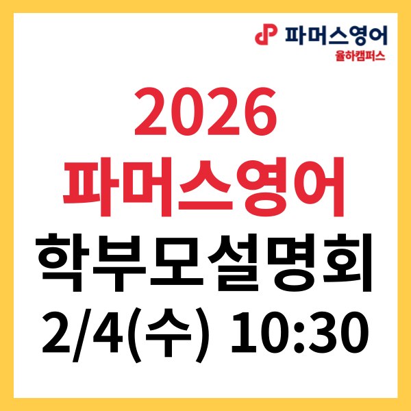 안녕하세요. 율하동 파머스영어학원 원장 Young쌤입니다~ 2026년 새해가 밝았습니다! 새해 복 많이 받으시고~ 올 한해 행복하신 일들만 가득하길 바랍니다^^ 2026년 새로운 해를 맞이하여 학부모설명회를 개최합니다. -학부모설명회 일정- 2/4(수) 10:30~(약 2시간) 장소: 파머스영어 율하캠퍼스 문의: 053-710-1505 율하동 파머스영어학원만의 독특하고 점을 영상으로 몇가지 보여드리겠습니다! 자세한 설명은 학부모설명회때 더 들어보실 수 있습니다^^ 1. 사운드닥터(파닉스 기초반) 알파벳도 잘 몰랐던 아이들이 음성학을 기반으로 만들어진 Sound Doctor 교재를 통해 소리가 글자가 되고 글자가 소리가 되는 놀라운 경험을 하게 됩니다. 사....... <img src="https://blogthumb.pstatic.net/MjAyNjAxMTlfMjUg/MDAxNzY4Nzg4OTQ2MzQ4.BBn09s6z6bndWbJa9dSda3yr_kCih4W4-s_x2lreXMcg._iEMRaFBoSMyN6LZrvaUN4bNesK0YrJ4Rpko9W_e534g.PNG/%C0%B2%C7%CF%B5%BF%BF%B5%BE%EE%C7%D0%BF%F8_2026%C7%D0%BA%CE%B8%F0%BC%B3%B8%ED%C8%B8.png?type=s3" />