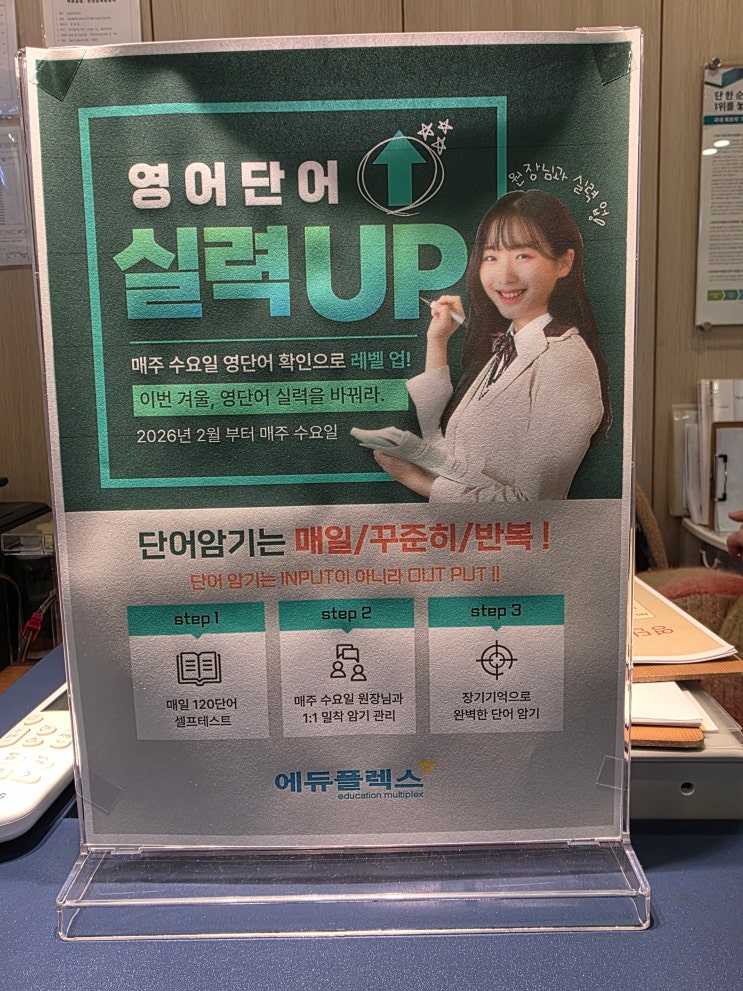 에듀플렉스 에듀코치 개별지도 칠곡 운암 학원의 영어 단어 관리법을 소개합니다 “단어는 외우는 것이 아니라, ‘써먹을 수 있을 때’ 진짜 내 것이 됩니다.” 영어 실력의 토대는 단연 어휘력입니다. 하지만 많은 학생들이 단어를 “봤다”거나 “한 번 외웠다"라는 이유로 안심하다가, 정작 독해나 시험 상황에서는 떠올리지 못하는 경우가 많습니다. 이 문제를 단순 암기 부족이 아니라, 학습 방식의 문제라고 판단합니다. 에듀플렉스 에듀코치 개별지도 칠곡 운암 학원의 학생들은 25년간 수성구 학생들을 지도해온 원장님의 '기적의 단어 암기법'으로 단어 학습을 하고 이런 문제점들을 개선하고 있습니다! 단어를 입력(inp....... <img src="https://blogthumb.pstatic.net/MjAyNjAyMDZfMjY3/MDAxNzcwMzU4MDU2MjQ1.aszYPscMqzCHr1k2jPnDXaqNpOFUJqfAh7TYPktuTW4g.FhV4VgCC77nB40RWRJv0fvu1ptox5ZYHCsUFS1eCAgwg.JPEG/KakaoTalk_20260206_145504575_09.jpg?type=s3" />