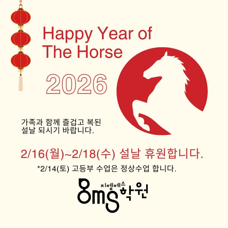 안녕하세요! 2026년 새해 설 연휴를 맞이하여 [지엠에스학원]에서 학원휴원 안내 드립니다. 또한 새학년, 새학기를 맞이하여 신규원생도 모집하고 있으니 많은 문의 바랍니다!! 설 연휴 기간인 2/16(월)~18(수)는 학원 휴원합니다. 2/14(토)에 고등부는 정상수업하니 꼭 "수업"하고 설 명절을 잘 보내도록 합시다! 설 연휴기간 잘 보내고 다시 학원에서 열심히 공부해요! 수학교육은 수학교육 전문학원인 [지엠에스학원]에서! https://open.kakao.com/o/sffJGpoe <img src="https://blogthumb.pstatic.net/MjAyNjAyMTBfMzAg/MDAxNzcwNzA2NDUyNjM5.4FjuhmN1VnwdiRatvdh8juifdbRJGray6-aXT1QRtMcg.Sb9fsFQiQMmOFJm9Uz9SbIscbME_DeG-yL7JbDz2kNgg.JPEG/%C8%DE%BF%F8%28%BC%B3%B3%AF%29.jpg?type=s3" />