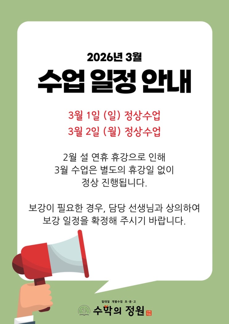 2월 16일~18일 설날 휴무 외에 3월과 4월에는 휴무일이 없습니다. 2월 설날 연휴로 인해 보강 수업이 필요한 학생들은 3월 2일까지 보강 수업 잡아주세요~ <img src="https://blogthumb.pstatic.net/MjAyNjAyMTBfNTQg/MDAxNzcwNzAyMTU5MDY0.7EaCqLcLUcqJpbBtUOyblZt6VNIZL0L0Dv04gODSuM0g.t_eFCQdsBwHv4JT7m9OiXY7UqJ6Dmr-ElweyfcMwMTsg.JPEG/IMG%A3%DF7905.JPG?type=s3" />