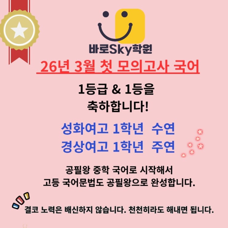 복현동의 기적 바로스카이에서 1등이 탄생했습니다. 새 학기 첫 단추를 꿰는 3월 전국연합학력평가에서, 바로스카이의 주연 수연 학생이 국어 영역에 당당히 1등이라는 대기록을 달성했습니다. 성화중학교 국어과목 1등, 2등의 이어 3월 첫 모의고사에서도 1등을 했습니다. 바로스카이의 자랑입니다. 주연, 수연이의 1등은 결코 우연이 아닙니다. 겨울방학 내내 흩어진 지식을 하나의 뼈대로 만드는 온톨로지 구조 독해를 체득하고, 몰입도를 체크하며 스카이쌤의 검인을 받아왔던 끈질긴 행동이 만들어낸 필연적인 결과입니다. 이 소식을 듣고 공필왕 홍진현 대표님의 축하 선물을 보내주셨습니다. 고등학교 올라가서도 공필왕 메타인지 훈련을....... <img src="https://blogthumb.pstatic.net/MjAyNjA0MDdfMTY5/MDAxNzc1NDkxMzYzNjUz.UglRKk3zvyt2C6ezgcMWoBNd2yCUOMxtA1tUYmEJ4GIg.axEfrDvT7yqtNAyB4D9aWOSA475e7ybAhiVfV-PU3hAg.JPEG/900%A3%DF1775103706595.jpg?type=s3" />