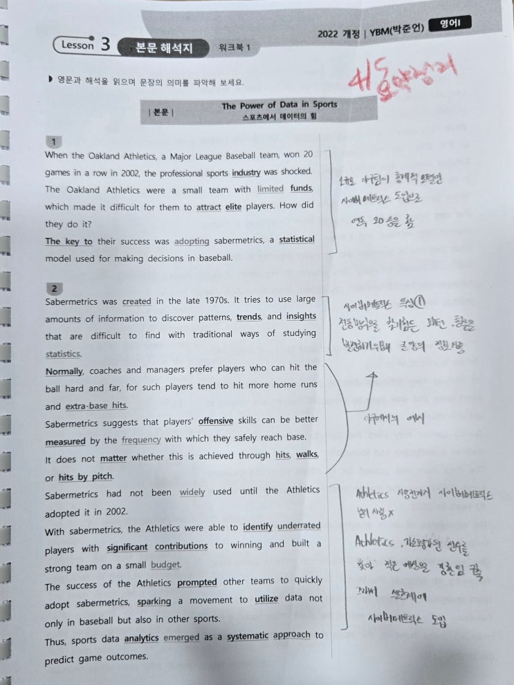 고2 영어 교과서 내신대비 교재입니다. 남학생이다 보니, 알록달록 색깔펜이나 형광펜을 쓰지는 않았지만, 자신이 배우고 이해한 내용을 정리/요약하려고 애쓴 흔적이 보입니다^^ 선생님의 설명이 끝나면 아이들이 자주 이렇게 말합니다. “이해됐어요.” 그런데 시험 결과는 그 말과 다르게 나오는 경우가 많습니다. 이유는 단순합니다. ‘이해한 것’과 ‘정리된 것’은 다르기 때문입니다. 수업 시간에는 설명을 들으면서 다 이해가 됩니다. 그 순간에는 흐름도 보이고, 맞는 것 같거든요. 그런데 혼자 문제를 풀려고 하면 막상 글의 구조가 잘 떠오르지 않습니다. 그래서 저희는 수업이 끝나면 반드시 한 번 더 스스로 정리하는 과정을 거치....... <img src="https://blogthumb.pstatic.net/MjAyNjA0MDdfMjQ1/MDAxNzc1NTYxMjcwMDcx.uCO7vMIjFw4rU26C5ughaS9AMSLUfkc5j37C2PpuAM4g.Gyisw7uuXRMwM5z1KwhXDH8e2JYC16zaokEIn9A06MYg.JPEG/KakaoTalk_20260407_192502940.jpg?type=s3" />