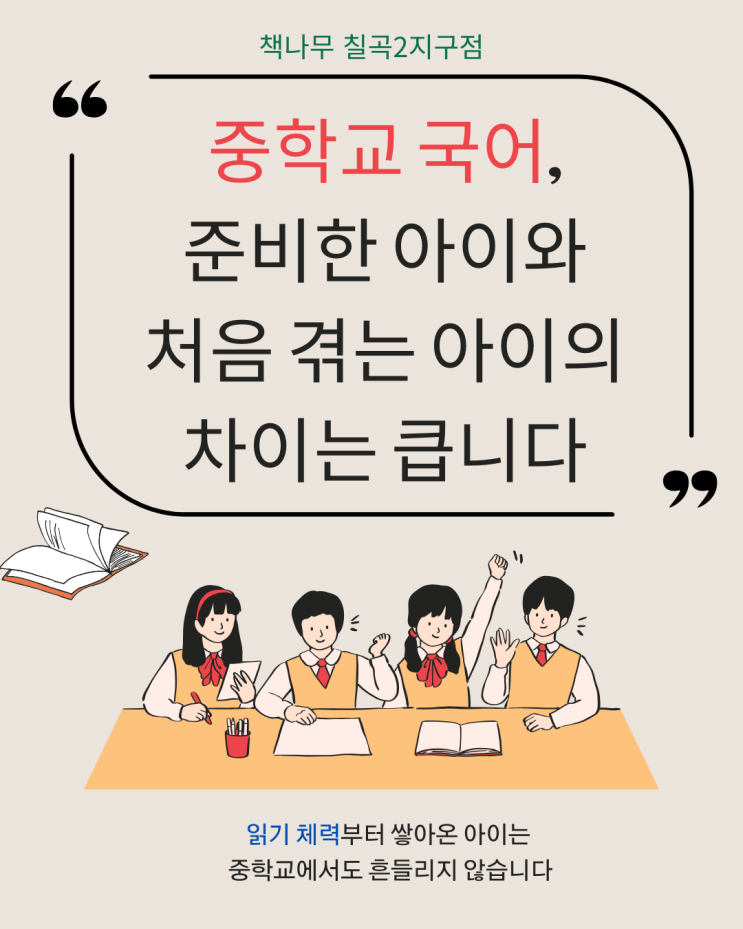 예비 중1 상담을 하다 보면 부모님들께서 거의 같은 말씀을 하십니다. “책을 싫어해요.” “읽는 양이 너무 적어요.” “집에서는 거의 안 읽으려고 해요.” 하지만 이 고민을 아이의 입장에서 들어보면, 문제의 모습은 조금 다르게 보입니다. 실제 중학교에 다니는 아이들 이야기를 들어보면 조금 다른 말들이 나옵니다. “시험칠 때 지문 읽을 시간이 부족해요.” “배경지식이 없어서 교과서가 무슨 말인지 잘 모르겠어요.” 이 말들은 아이가 공부를 안 해서 나오는 말이라기보다, **중학교 국어의 글을 ‘처음 겪고 있기 때문’**에 더 가깝습니다. 중학교 국어는 왜 갑자기 어려워질까 중학교에 올라가면 국어 지문은 갑자기 길어지고, 한....... <img src="https://blogthumb.pstatic.net/MjAyNTEyMjRfMTc3/MDAxNzY2NTM4MjUwNjY4.CIFDh8fRSGgxUvQesCrOZuSnXSjMCwt2qjA6iLJde8Ag.xXduI7xDSl0w_8UwFe55Dx2EdkMFKrvyBIBYFECPv-8g.PNG/%BB%E7%BA%BB_-%BA%A3%C0%CC%C1%F6%BB%F6_%B9%E8%B0%E6_%C3%BB%BC%D2%B3%E2_%C0%CF%B7%AF%BD%BA%C6%AE_%C1%DF%C7%D0%BB%FD_%B0%F8%BA%CE_%BE%C8%B3%BB_%C0%CE%BD%BA%C5%B8%B1%D7%B7%A5_%B0%D4%BD%C3%B9%B0_%281%29.png?type=s3" />