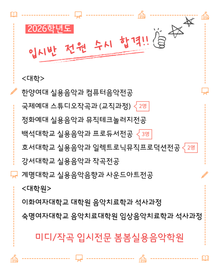 2026 합격 대학 ‼️입시반 전원 수시 합격‼️ 역대급으로 힘들었던 올해 입시가 마무리 되었습니다 대부분 우리학원에서 3년 이상 입시반을 수강했던 학생들이고 올해 5월에 음악을 처음 시작했던 학생도 있었습니다 다들 수고많았고~~ 대학생활 즐겁게 잘 하길바라며~~ 2027 입시를 위해 자료정리에 들어갑니다✨ 올해 입시과정과 쌓인 정보들은 다음 고3들에게 좋은 밑거름이 될것입니다 현 고2 입시반 친구들은 벌써 고3 모드로 전환했거든요 내년 입시도 화이팅!! ⭐️예고부터 대학원까지 미디/작곡 입시전문 ⭐️음악치료 및 음악임용실기 세련된 반주완성 ⭐️서울 강남/홍대 입시반 출강경력 원장....... <img src="https://blogthumb.pstatic.net/MjAyNjAxMTBfMTA5/MDAxNzY4MDI2MTM5OTky.IOowZPam12Ge1o0PJrpBErdFdFmDb-dRh_DZ4jmwoq4g.QpDZN0drBd1hw_1ro5dAyc0m4vwsaq5471KQUs0sbI8g.PNG/2026%C7%D5%B0%DD%B4%EB%C7%D0.png?type=s3" />