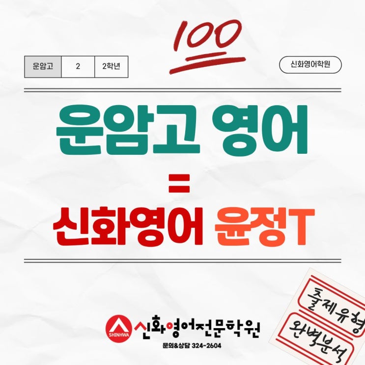 안녕하세요! 칠곡3지구 대표영어학원 신화영어입니다! 이번 포스팅에서는 신화영어의 자랑 운암고 스폐셜 리스트 윤정선생님을 소개하려고 합니다. 윤성선생님 소개에 앞서 운암고는 IB관심학교이기에 타학교와 다르게 교과서나 부교재없이 모의고사와 학교프린트물로만 시험을 출제하고 있습니다. 그리하여 시험대비도 이에 맞춰서 선생님께서 직접 문제와 자료들을 만드셔서 진행하고 있습니다. 그런데!!!! 분석지며 문제며 직접 만들어야하니 쉽지 않겠죠? 학생들에게 주어지는 양질의 자료가 학생의 성적과 연결될 수 있으니까요! 그런데!!!! 신화영어에는 이 모든 것을 커버하는 운암고전담 윤정 선생님이 있다는 사실!! 시험대비를 어떻게....... <img src="https://blogthumb.pstatic.net/MjAyNjAxMTJfMjk4/MDAxNzY4MjAyODQ0NjE5.80hZ40yhAeUy2qn_rGjHmPb1D8kG-oFhQ4hFdq7LQQUg.8kTGzcb0YAmXRxyZN8anX-HEQ78KVGRtYmQDj8sOXUgg.JPEG/%C1%A6%B8%F1%C0%BB_%C0%D4%B7%C2%C7%D8%C1%D6%BC%BC%BF%E4_%281%29.jpg?type=s3" />
