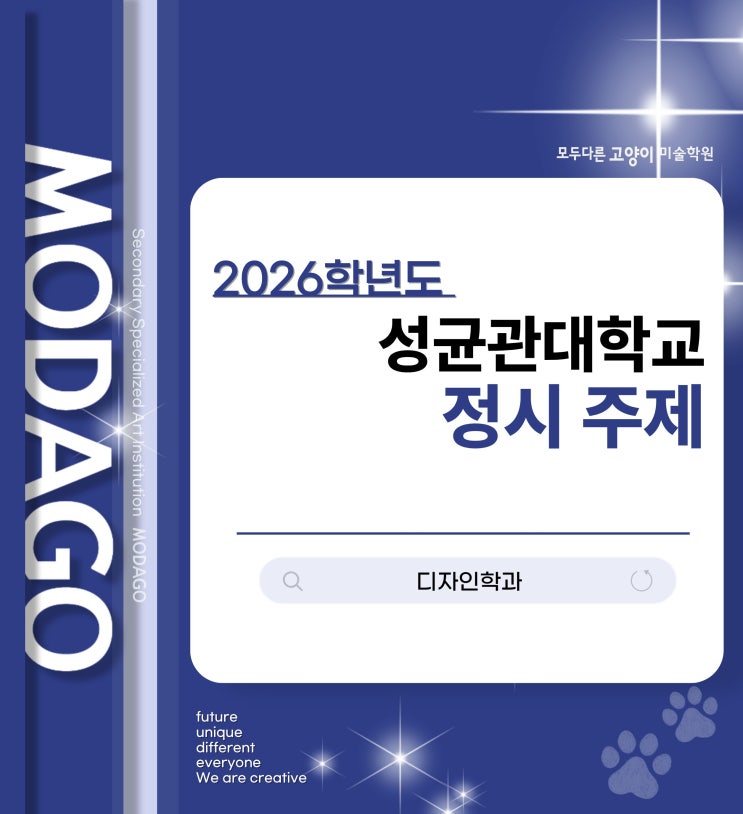 대구입시미술학원 수성구 범어동 미대입시 명문 S.S.A Secondary Specialized Art Institution MoDaGo 모두다른고양이미술학원입니다. 2026 정시 미대입시 성균관대 디자인학과 실기 출제 주제(문제) 소식을 전하겠습니다. 주제어: 미래의 골목길 ※디자인학과(기초소양) -화지 1: 정밀 소묘(연필) -화지 2: 사고의 이미지화 -제시물: 투명압정 3개 이상 2026학년도 정시 미대입시 성균관대학교 디자인학과 실기 출제 문제(주제) 입시 정보를 전해드렸습니다. 입시생 여러분에게 유용한 정보가 되길 바라며, 대구모다고미술학원이 2026 여러분의 합격을 함께 응원합니다! 2026학년도 미대입시! 합격을 응원합니다! ⭐️압도적 합격률⭐️ ⭐️모....... <img src="https://blogthumb.pstatic.net/MjAyNjAxMDhfNDUg/MDAxNzY3ODQ3OTMxNjcz.GzYdGiM6eBMO39kbmy2n4NhJBWIHHaaboBO7iTp74EEg.9bdxK_d24IAAcwrh6DO7DWe1giP0eyoh5aAXeTO0sdgg.JPEG/KakaoTalk_20260107_233131025.jpg?type=s3" />