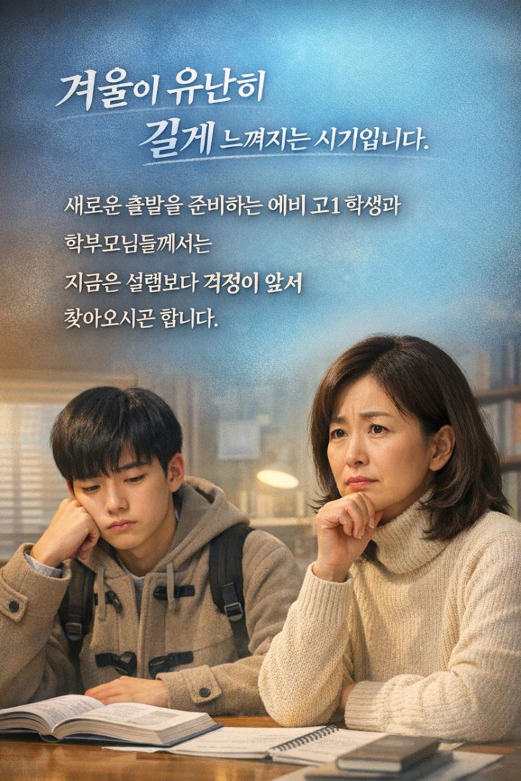 겨울이 유난히 길게 느껴지는 시기입니다. 새로운 출발을 준비하는 예비 고1 학생과 학부모님들께서는 지금은 설렘보다 걱정이 앞서 찾아오시곤 합니다. "예비 고1 준비, 출발선이 결정합니다." 물론 다른 학년에 위치한 학부모님들도 이래저래 걱정이 많으실거 잘 압니다. 학년에 상관없이 답답한 마음에 상담하시는 듯한 느낌으로 읽어주시면 조금 걱정이 덜어질까 하는 마음에 이번에 새로이 여러분들을 찾아뵌 제가 이 글을 드립니다. 고1 3월 모의고사와 고1 첫 내신의 흐름은 단순한 점수표가 아닌 학습 준비의 진단서입니다. 진단기준이 흔들리면 자칫 치명적인 결과가 나올 수 있습니다. 그래서 예비 고1 준비는 시작선 안정화....... <img src="https://blogthumb.pstatic.net/MjAyNjAxMDlfMTMy/MDAxNzY3OTQ0OTg2NzA1.wqB0Cn3qDZdk7gaD4xkhwQKjbowi-iiHdfngrsbUXhEg.3eYEiIcPdtw_8dRHmgvL9V8CkOYPeIfxZE-yh4rRjQsg.JPEG/ChatGPT_Image_Jan_9%2C_2026%2C_04_49_24_PM.jpg?type=s3" />