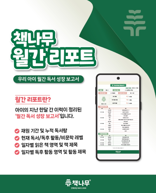 안녕하세요. 노변책나무입니다.^^ 노변책나무에서는 아이들의 독서 과정을 보다 체계적으로 확인하실 수 있도록 2026년 3월부터 책나무 월간 리포트를 학부모님께 발송하고 있습니다. 아이들이 한 달 동안 어떤 책을 읽고, 어떤 활동을 통해 생각을 정리했는지 한눈에 확인하실 수 있는 월간 독서 성장 보고서입니다. 책나무 월간 리포트란? 월간 리포트는 아이의 지난 한 달 독서 활동이 정리된 월간 독서 성장 보고서입니다. 단순히 읽은 책 목록만 전달되는 것이 아니라 아이의 독서 흐름과 학습 과정을 함께 확인할 수 있도록 구성되어 있습니다. 월간 리포트를 통해 다음과 같은 내용을 확인하실 수 있습니다. 재원 기간 및 누적 독서량 현....... <img src="https://blogthumb.pstatic.net/MjAyNjAzMDVfMTM3/MDAxNzcyNzA1MTMyODEy.CpGKrPeP_oHjYL3ClNZy5dX34kRHa1P0-h6j0_349lcg._TkB67fm5hkguipznqzjdaFyJdCfiTkEukMClwMAfnQg.PNG/1.png?type=s3" />