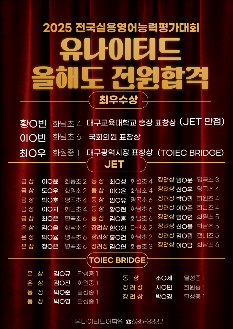 안녕하세요, 화원명곡 유나이티드어학원입니다. 2025년 하반기 전국학생 실용영어능력평가대회의 결과가 방금 도착 했습니다. 수상자 명단을 전해드립니다. 겨울방학 동안 아이들이 꾸준히 노력하며 시험을 준비한 결과, 전원 합격이라는 값진 성과를 이루었습니다. 학원에서는 이를 축하하기 위해 작은 시상식을 진행하였고, 아이들의 노력과 성장을 함께 나누는 시간을 가졌습니다. 수상의 현장을 보겠습니다^^ 최우수상 수상자들^^ 황0빈 화남초4 대구교육대학교 총장 표창상 (JET 만점) 이0빈 화남초6 국회의원 표창상 (JET 1.2급) 최0우 화원중1 대구 광역시장 표창상 ( TOEIC BRIDGE ) 우리 멋진 Little Genius Class 친구들~~ 처음 준비하....... <img src="https://blogthumb.pstatic.net/MjAyNjA0MDFfMTUx/MDAxNzc1MDQwNDMzMjU1.feFbHf7nByKGlRHD1VWRPiOq7AzUAShv_AasNngwzAkg.46QFRIcNlD9iQ7MF11CVXo46VLD649_CBJVJwUi2vEAg.PNG/3.png?type=s3" />
