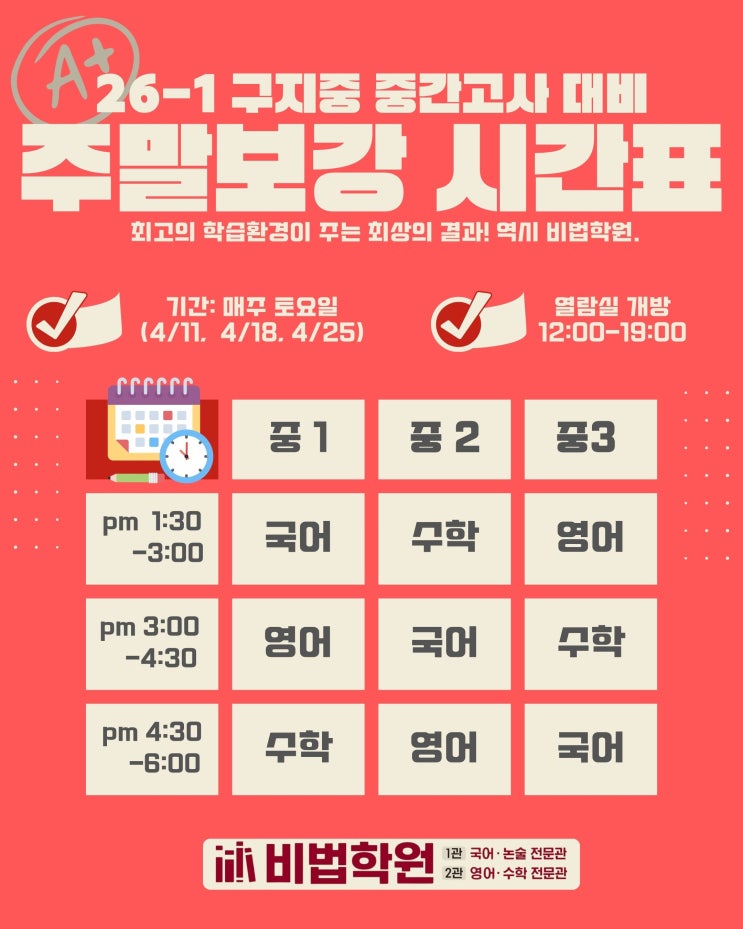 [26-1] 구지중 중간고사 대비 주말보강 시간표 [구지면 국가산단 비법학원]