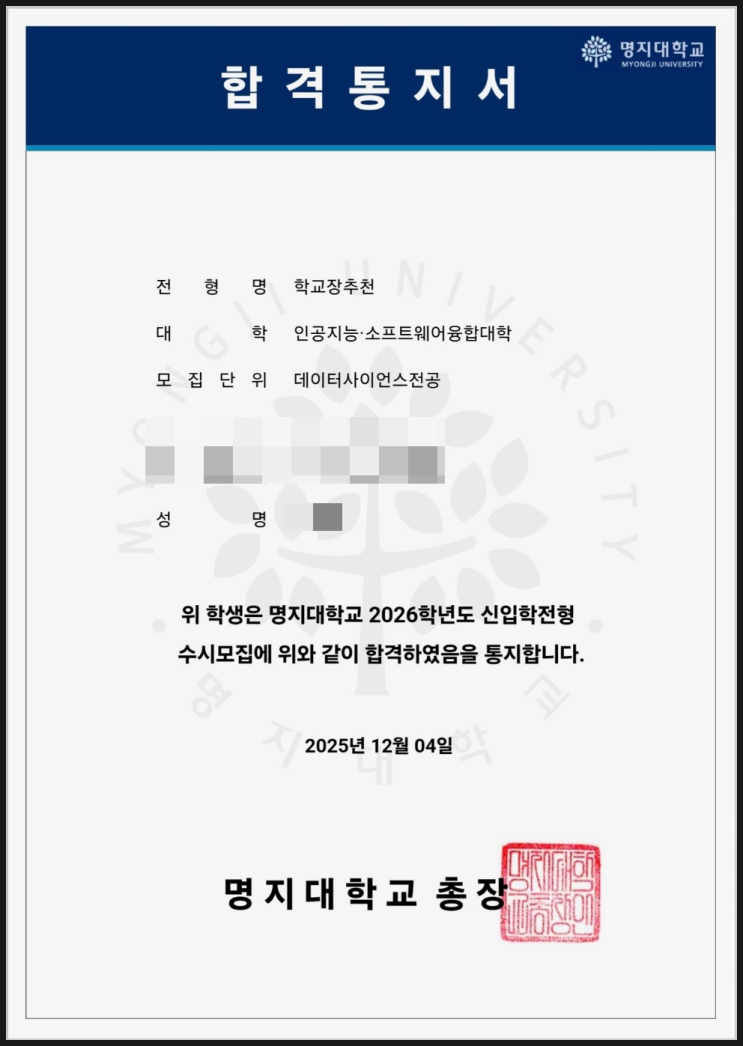 상명대학교 서울캠퍼스 수학교육과 합격입니다! 명지대학교 데이터사이언스전공 합격입니다! 수고 많았습니다. 축하합니다~~~ <img src="https://blogthumb.pstatic.net/MjAyNTEyMDRfMTE1/MDAxNzY0ODI5ODM3MzM2.xPjAp0IQdr9vWYS1lp2_U0oiPAugSq2ZZ1a-RWNB4Rog.0EH1lDzsyVBjSTCbRFCoSqfWITEuiF8HelJHrI8gx7kg.PNG/image.png?type=s3" />