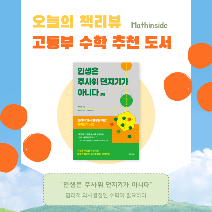 안녕하세요 아이들의 학습 방향을 함께 고민하는 매쓰인사이드 수학학원입니다 . . . . . 오늘은 수학을 좋아하는 분들뿐 아니라 “생각하는 방식”에 관심 있는 분들에게 추천하고 싶은 책 한 권을 소개하려고 합니다. 인생은 주사위 던지기가 아니다 제목부터 꽤 인상적입니다. 우리는 종종 세상이 운에 의해 결정되는 것처럼 생각합니다. 하지만 이 책은 그 생각에 조금 다른 질문을 던집니다. 우리의 판단은? 우리가 내리는 판단은 생각보다 불완전합니다 우리는 매일 수많은 선택을 합니다. 어떤 뉴스가 맞는지 누구의 말을 믿어야 하는지 어떤 정보가 사실인지 끊임없이 판단합니다. 그런데 막상 그 판단의 근거를 생각해 보면 대....... <img src="https://blogthumb.pstatic.net/MjAyNjAzMDZfNDYg/MDAxNzcyNzg4NDAyODE0.pfmc58qYoACmi5c1ROEJ1F78POMW6FF8PiPRaw6OHDgg.c5F9PGTkq4A8L7JP6b_lwbp7r80uP7TqC_tUg-X91hwg.PNG/%C3%A5%B8%AE%BA%E4-001_%286%29.png?type=s3" />